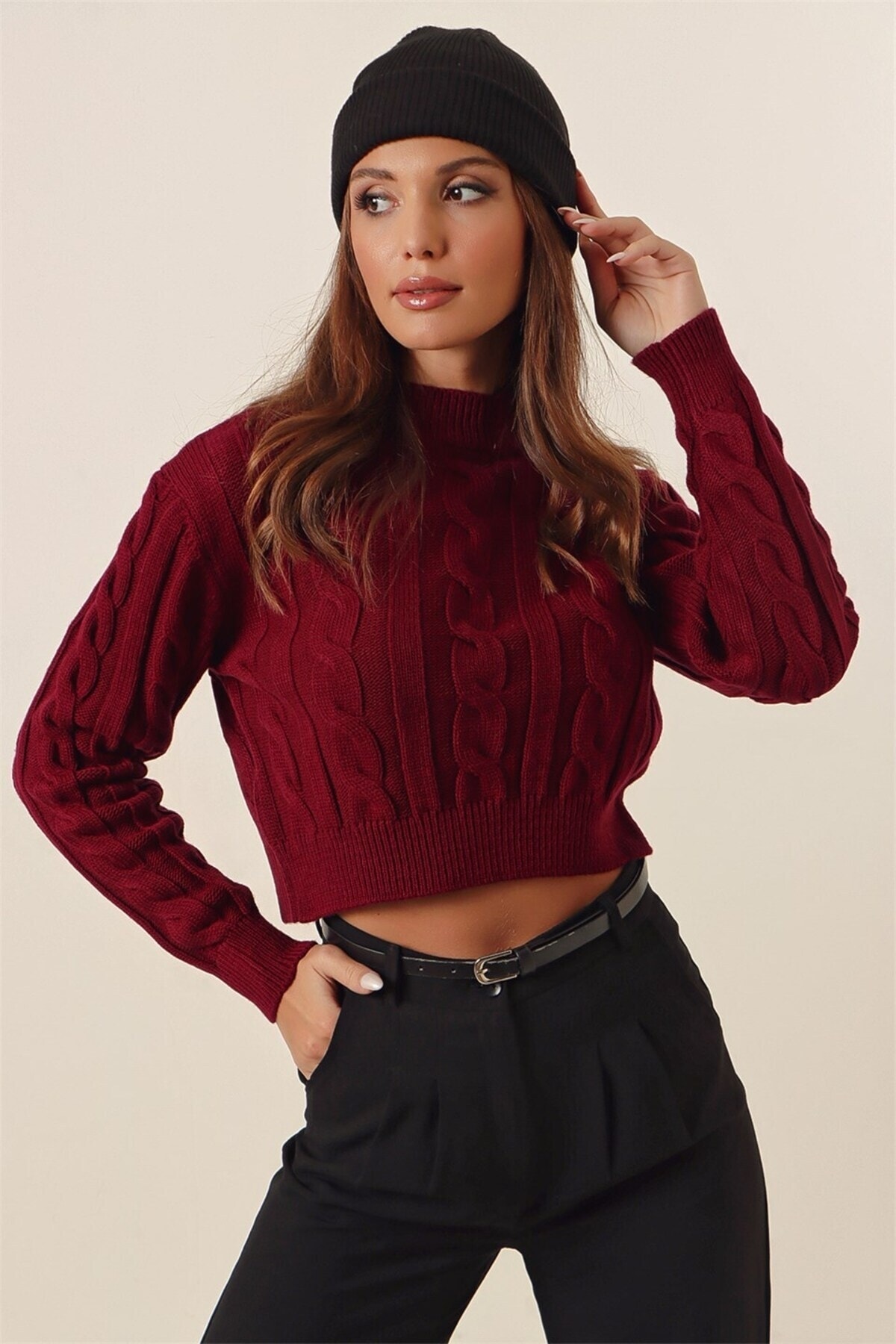 Bisiklet Yaka Ara Boy Saç Örgü Kadın Triko Kazak Bisiklet Yaka Ara Boy Saç Örgü Kadın Triko Kazak DRS91 XL