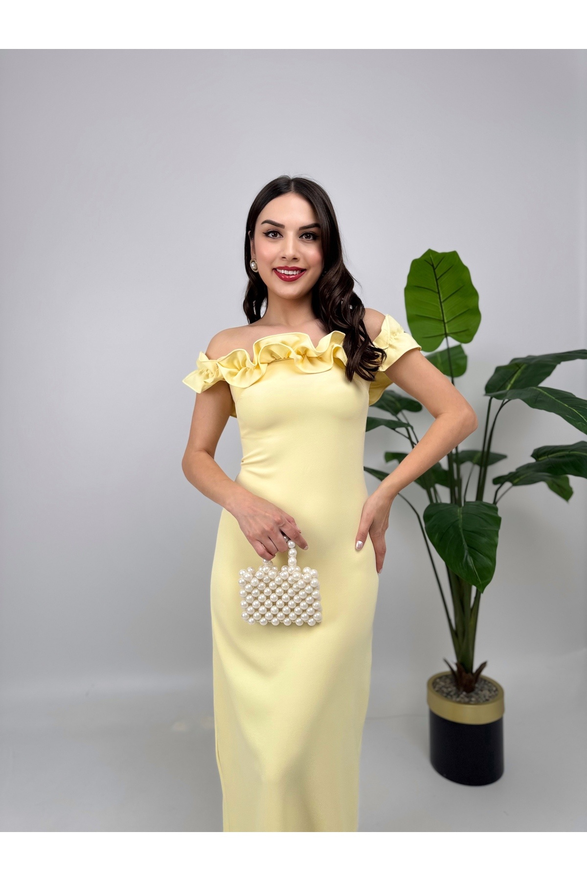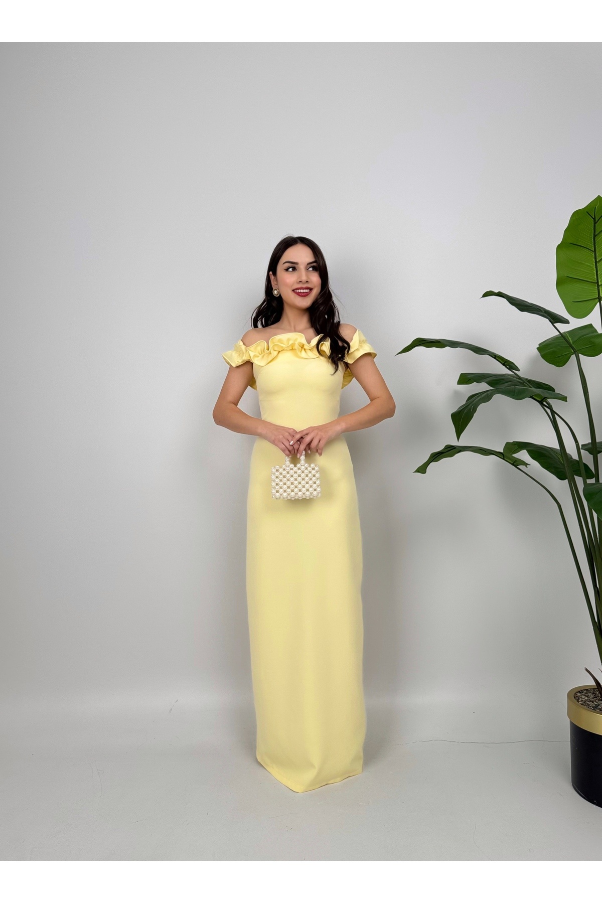 Sarı Fırfırlı Kayık Yaka Uzun Abiye Elbise Sarı Fırfırlı Kayık Yaka Uzun Abiye Elbise 3021 XL