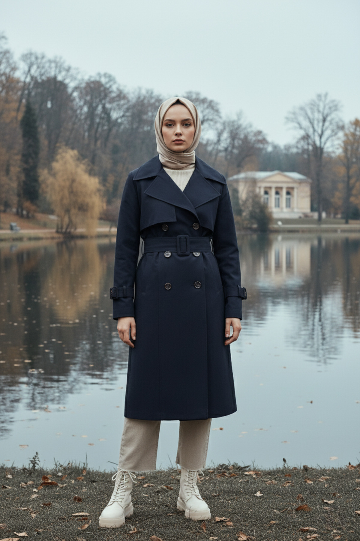 Lacivert - %100 Pamuk Uzun (110CM) Astarlı Kadın Tesettür Trençkot 1111-TES Lacivert - %100 Pamuk Uzun (110CM) Astarlı Kadın Tesettür Trençkot 1111-TES XS-S