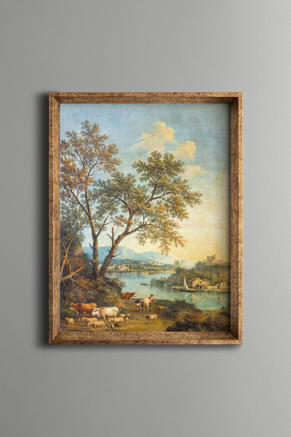 Çoban ve Arkasında Bir Köy Bulunan Bir Nehir Manzarası - Vintage Desenli Çerçeve Çoban ve Arkasında Bir Köy Bulunan Bir Nehir Manzarası - Vintage Desenli Çerçeve art20182 50 x 70