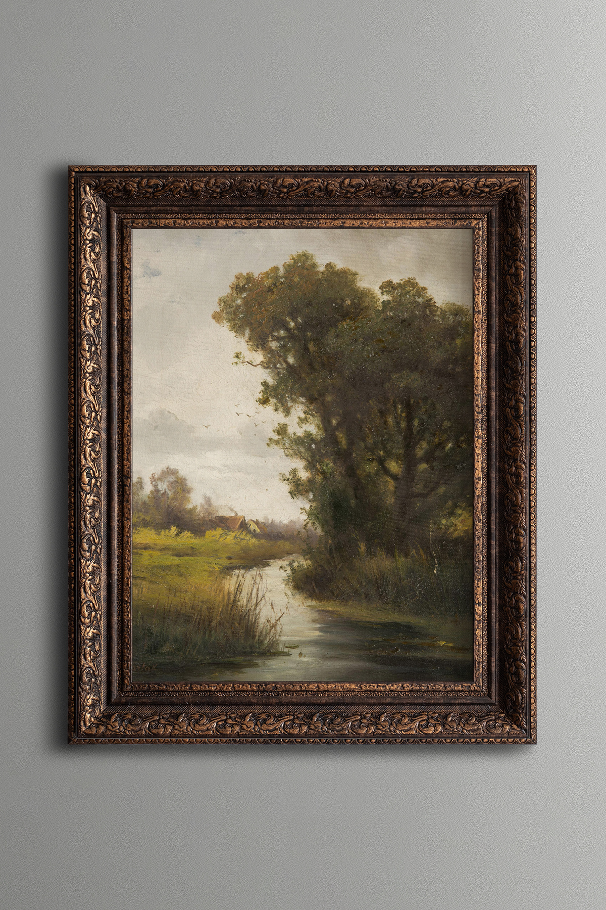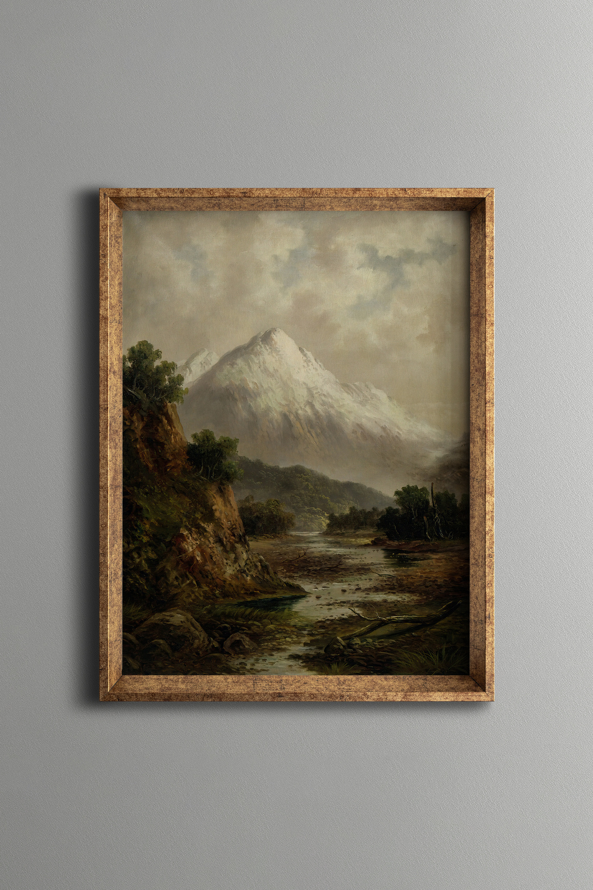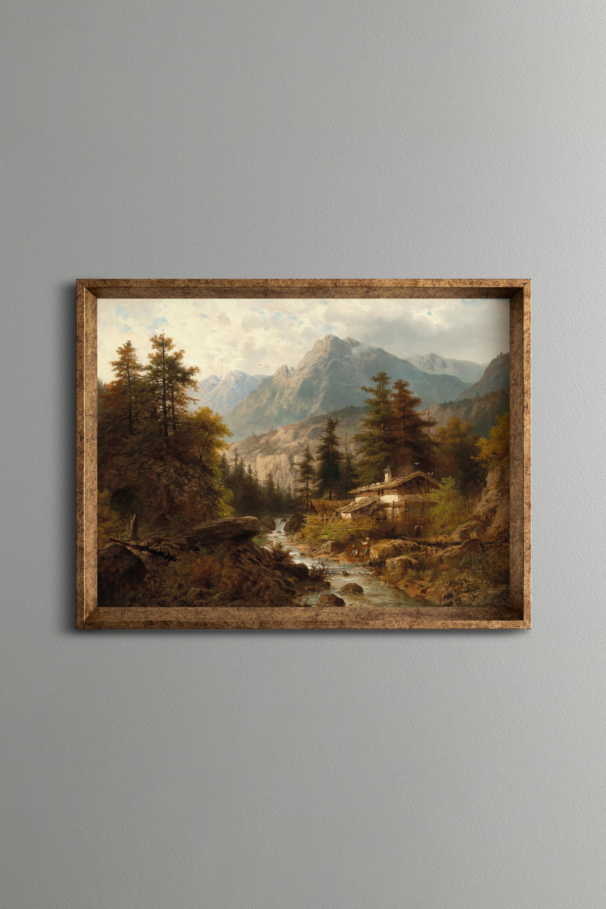 Bir Derede Balıkçıyla Dağ Manzarası - Vintage Desenli Çerçeve Bir Derede Balıkçıyla Dağ Manzarası - Vintage Desenli Çerçeve art20263 30 x 40