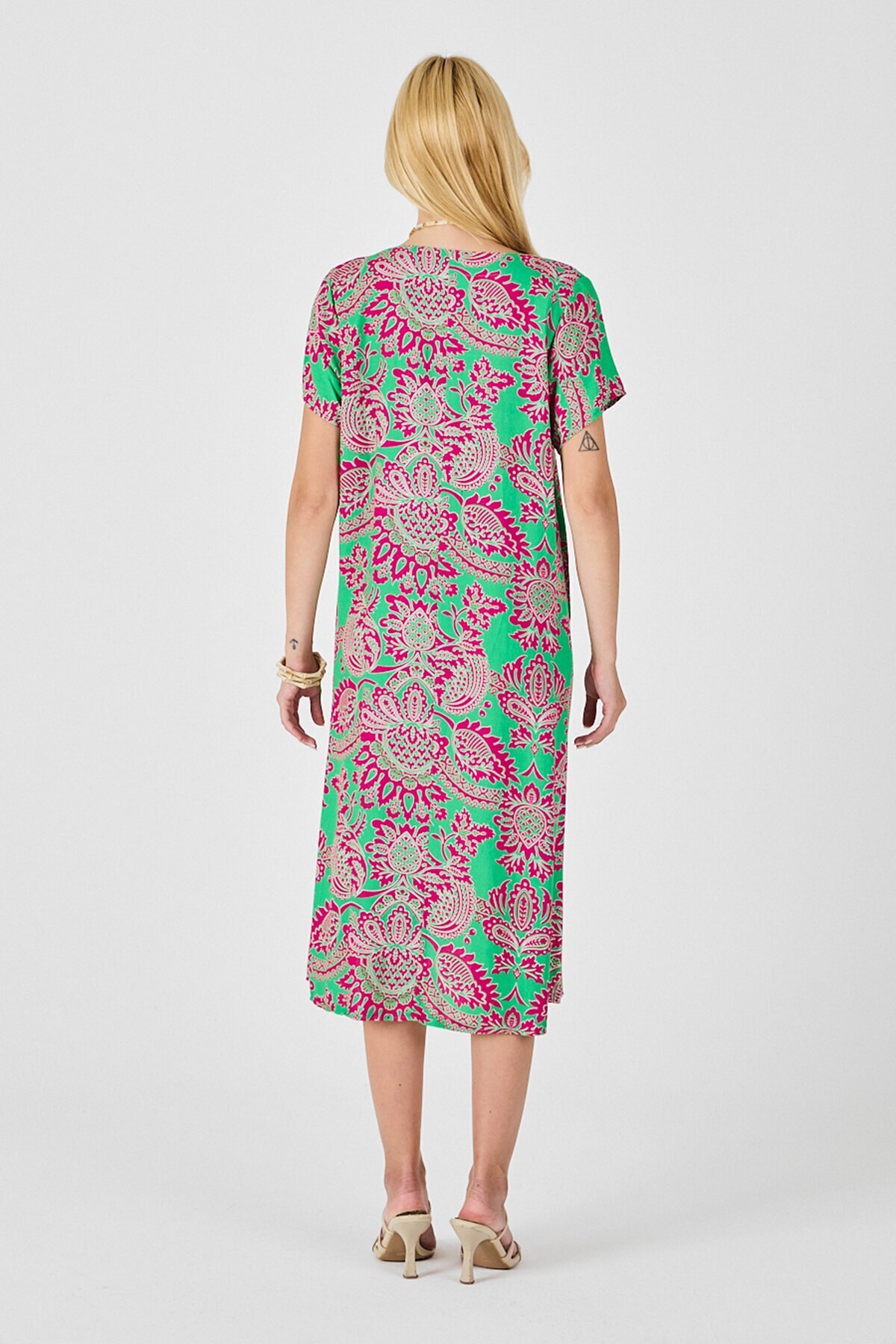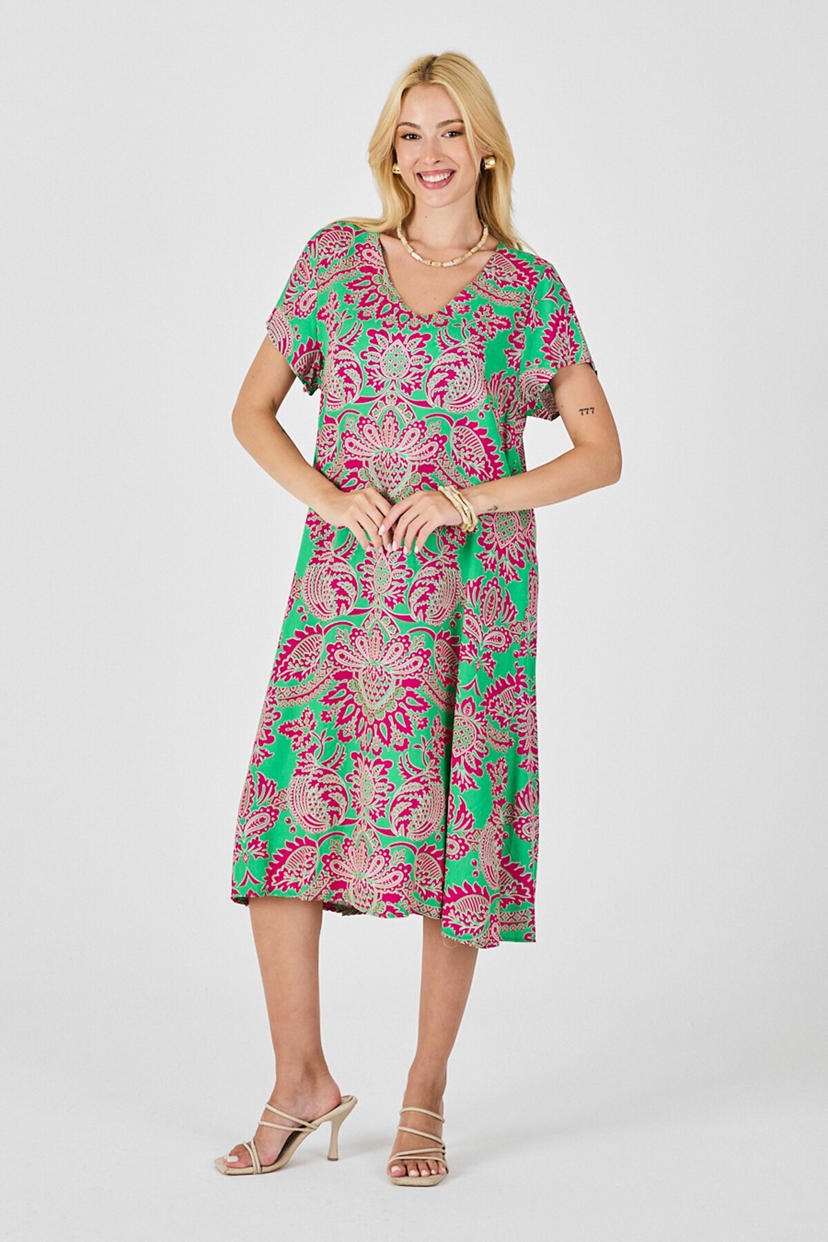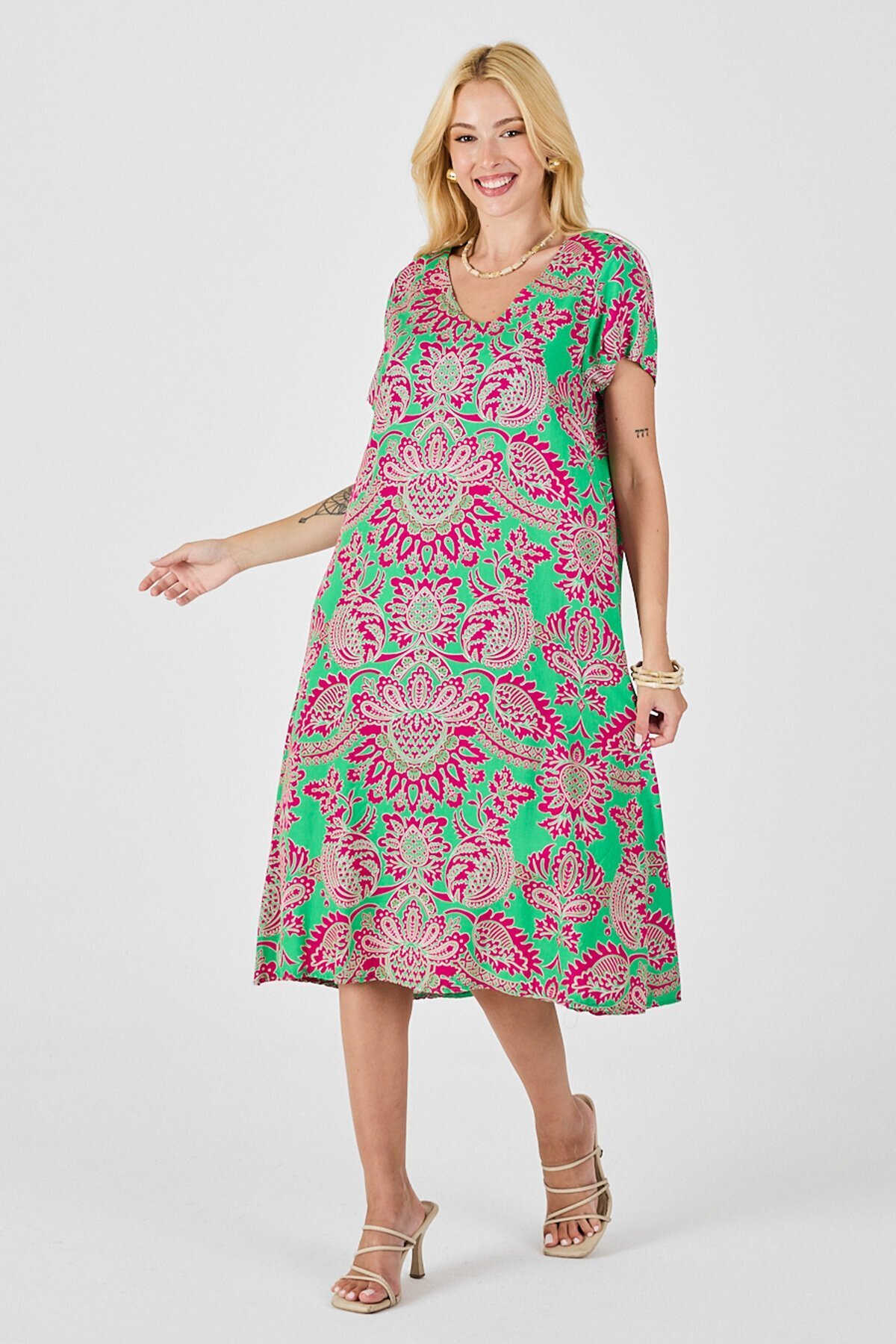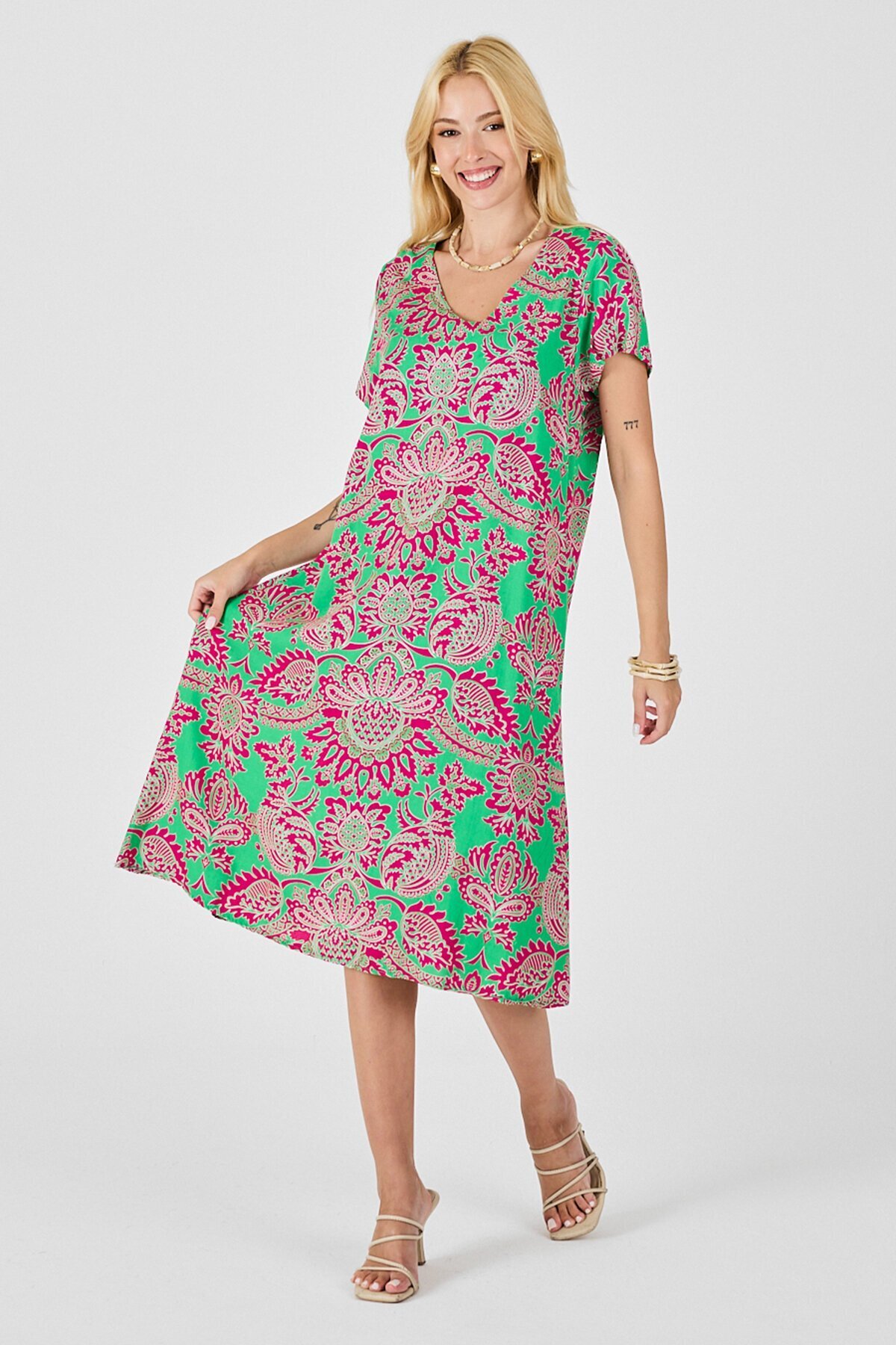 Kadın Pembe Desenli V Yaka Kısa Kollu Midi Boy Elbise Vs00820 Kadın Pembe Desenli V Yaka Kısa Kollu Midi Boy Elbise Vs00820 VS00820 XL