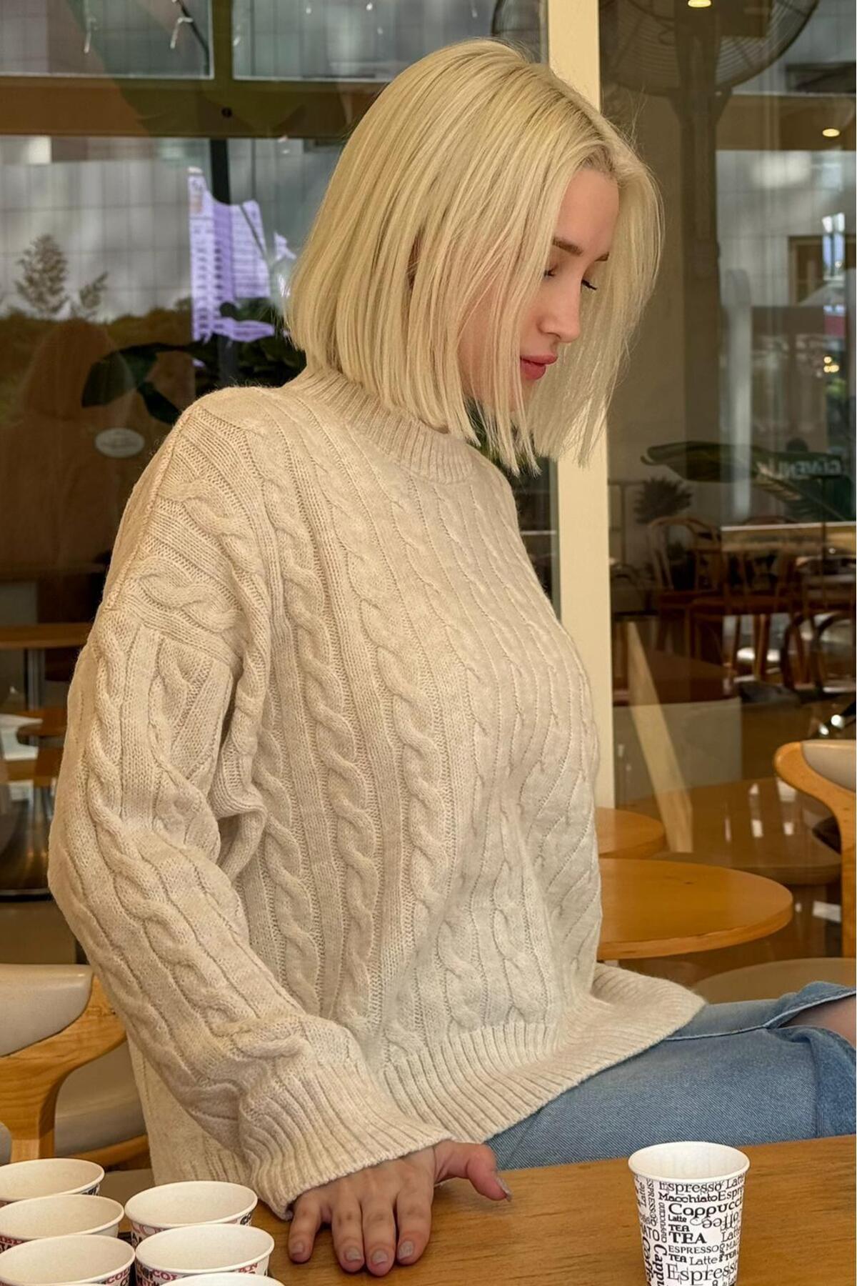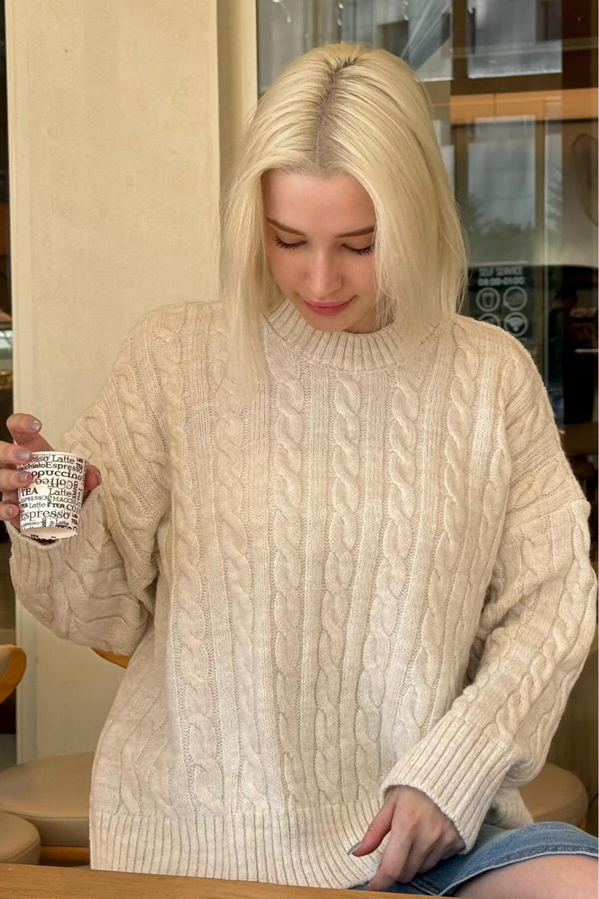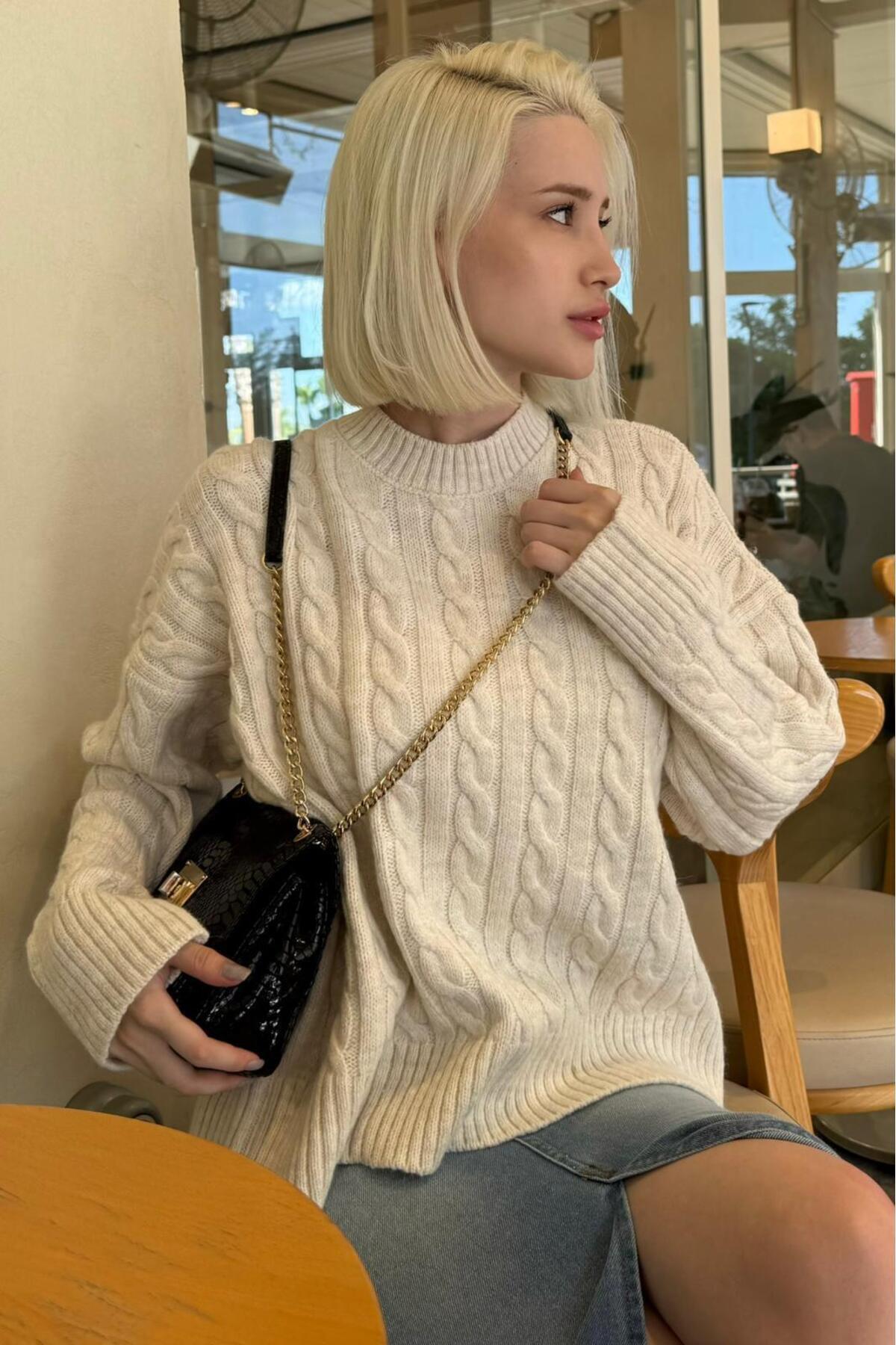 Ekru Bisiklet Yaka Örgü Desenli Kadın Triko Kazak MG2520 Ekru Bisiklet Yaka Örgü Desenli Kadın Triko Kazak MG2520 L