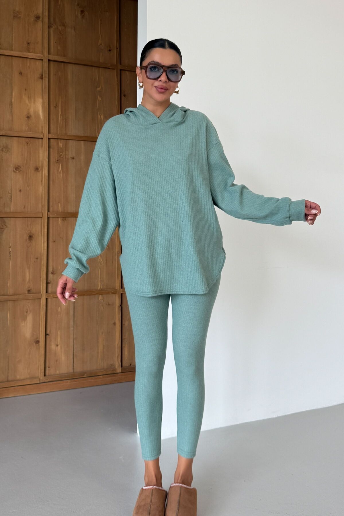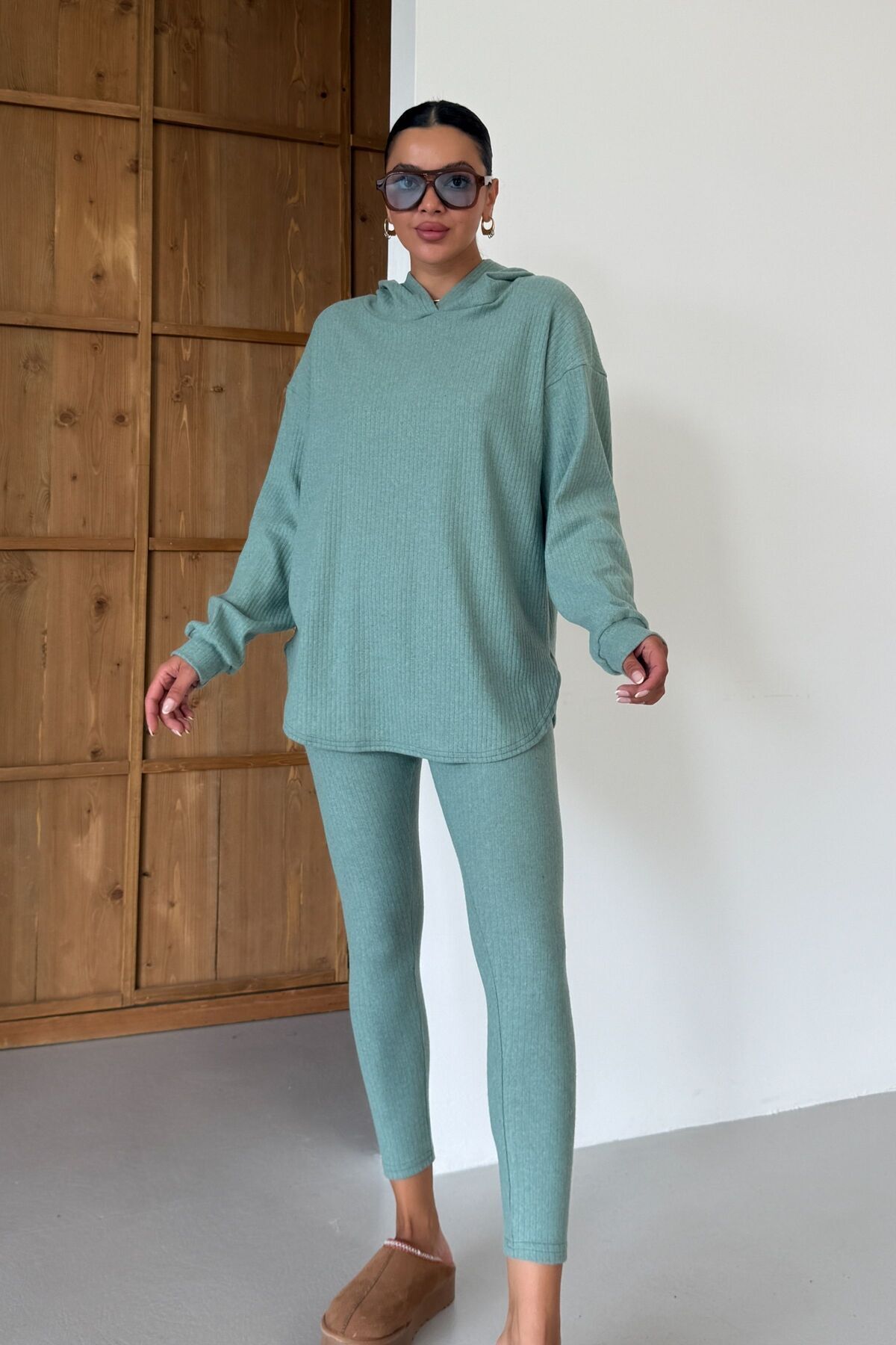 Kadın Mint Yeşili Oval Bel Detay Fitilli Kapüşonlu Taytlı İnterlok Takım Kadın Mint Yeşili Oval Bel Detay Fitilli Kapüşonlu Taytlı İnterlok Takım KN-BLDTYTKMFTLL XL