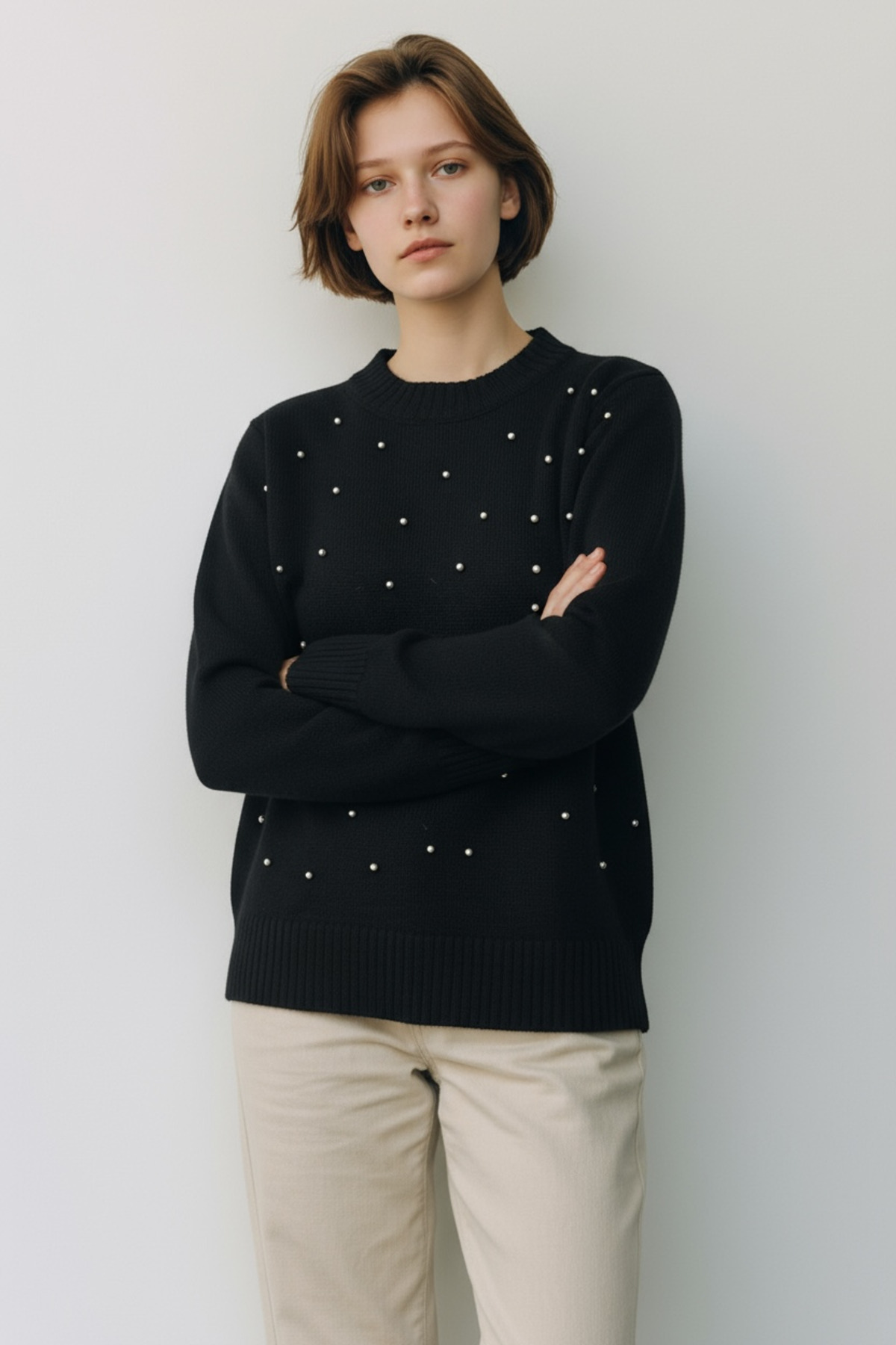 İnci Detaylı Örgü Desenli Salaş Triko Kazak Bisiklet Yaka Rahat Kalıp Şık Günlük Model İnci Detaylı Örgü Desenli Salaş Triko Kazak Bisiklet Yaka Rahat Kalıp Şık Günlük Model NLT1NC Standart