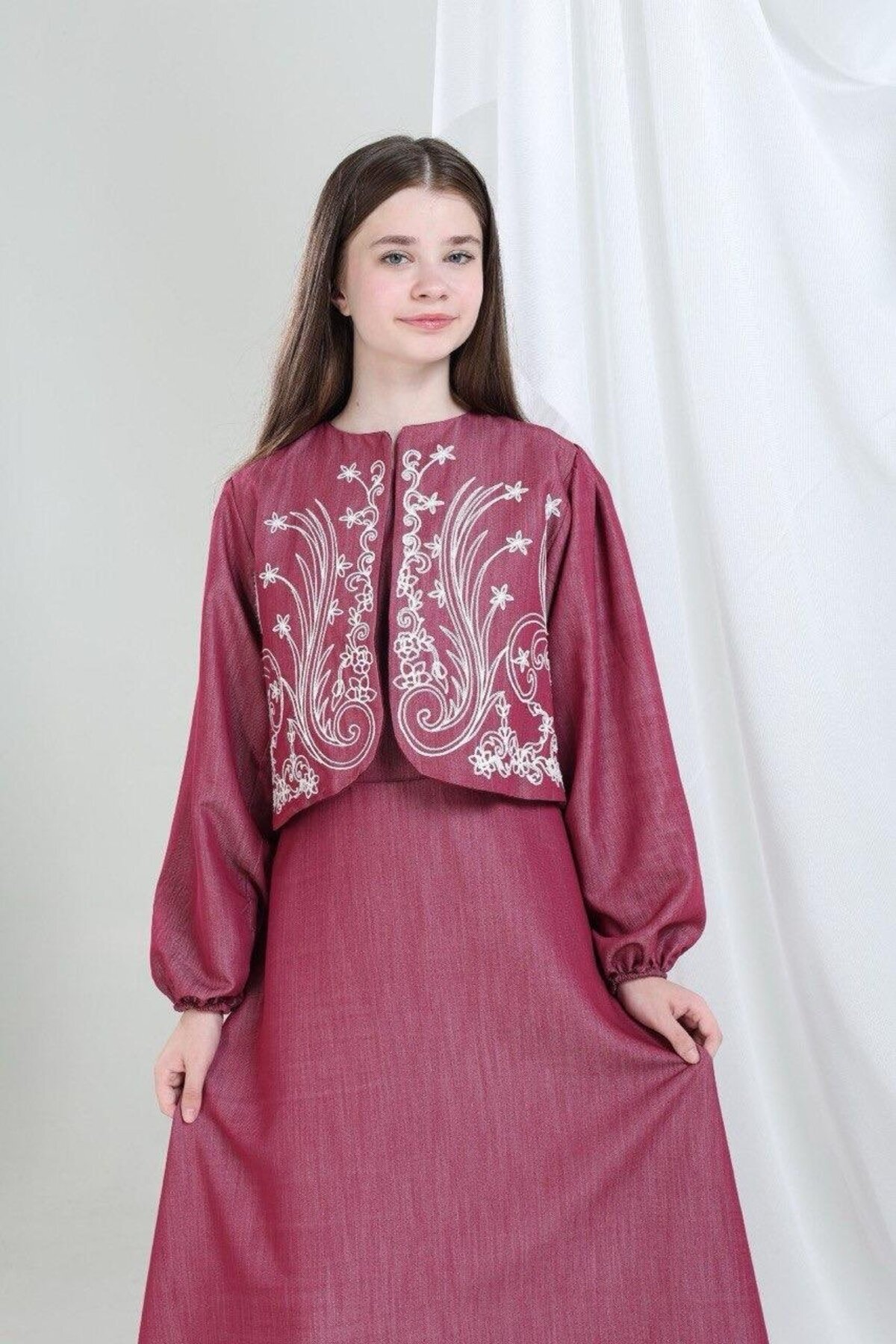 Nakışlı Ceketli Pamuk Keten Elbise Bordo Nakışlı Ceketli Pamuk Keten Elbise Bordo 00278 15-16 Yaş