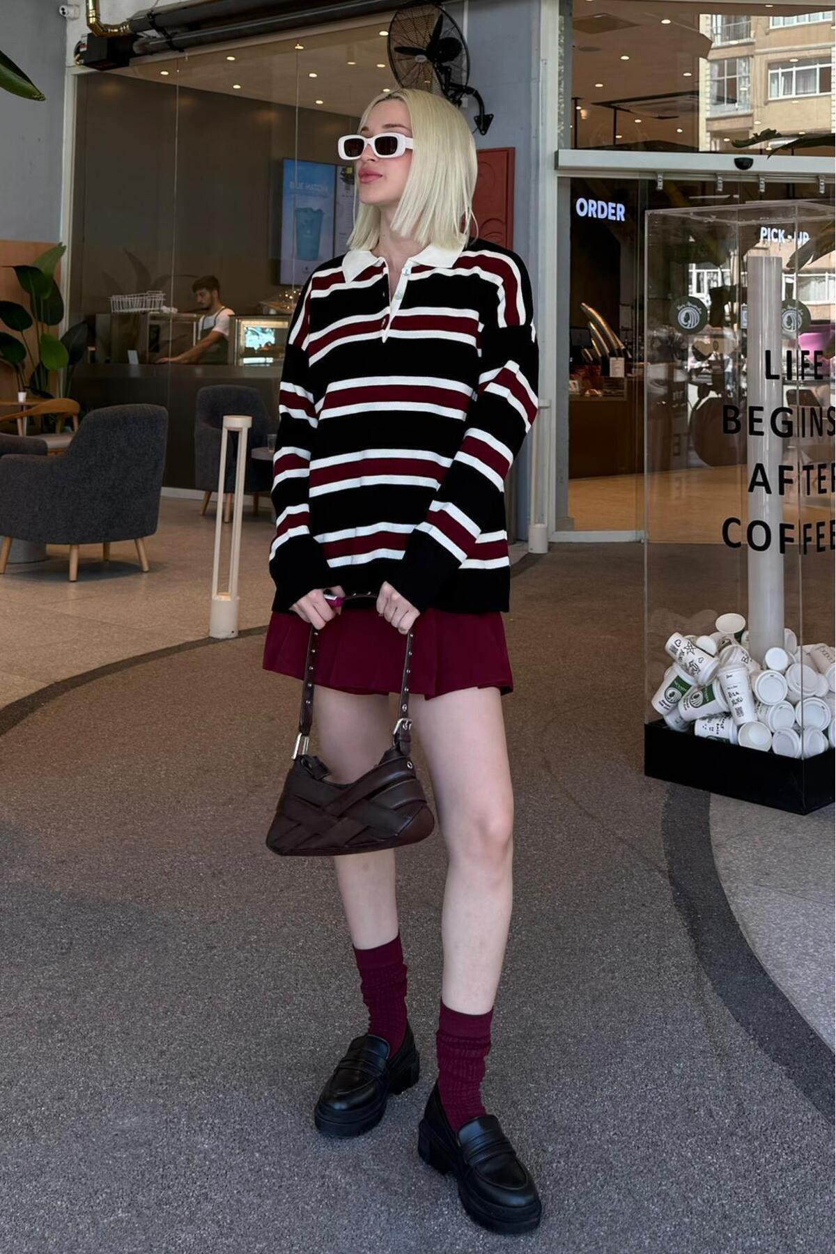 Siyah Çizgili Düğmeli Polo Yaka Kadın Triko Kazak MG2280 Siyah Çizgili Düğmeli Polo Yaka Kadın Triko Kazak MG2280 XL