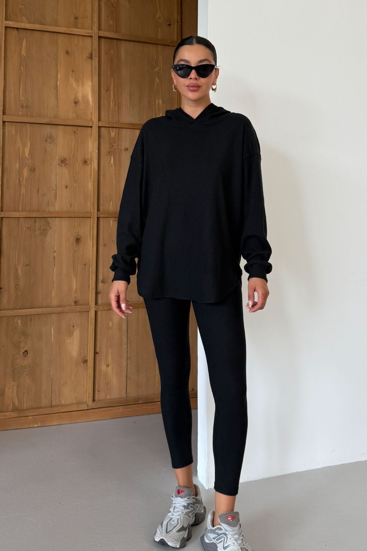 Kadın Siyah Kapüşonlu Fitilli Alt-Üst Taytlı İnterlok Takım Kadın Siyah Kapüşonlu Fitilli Alt-Üst Taytlı İnterlok Takım TaytlıTk XL