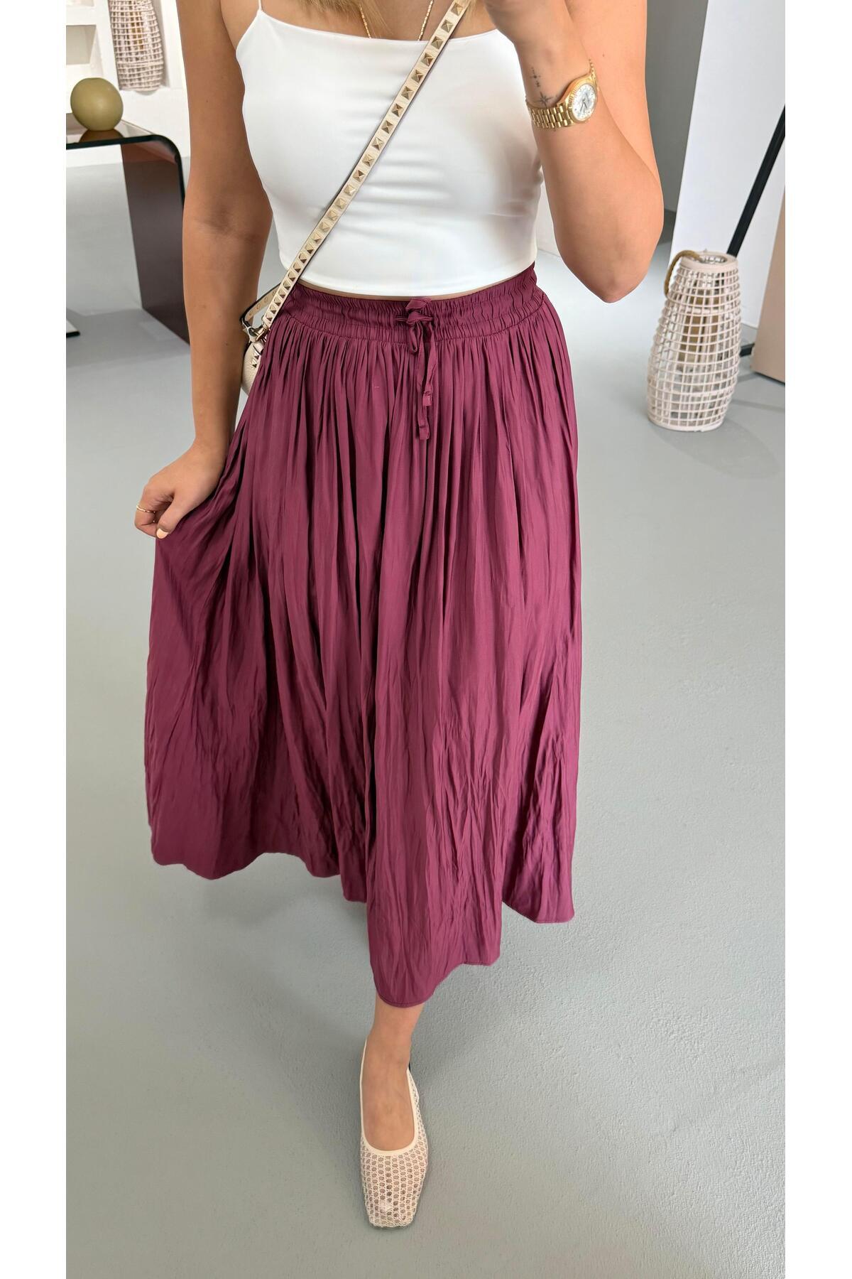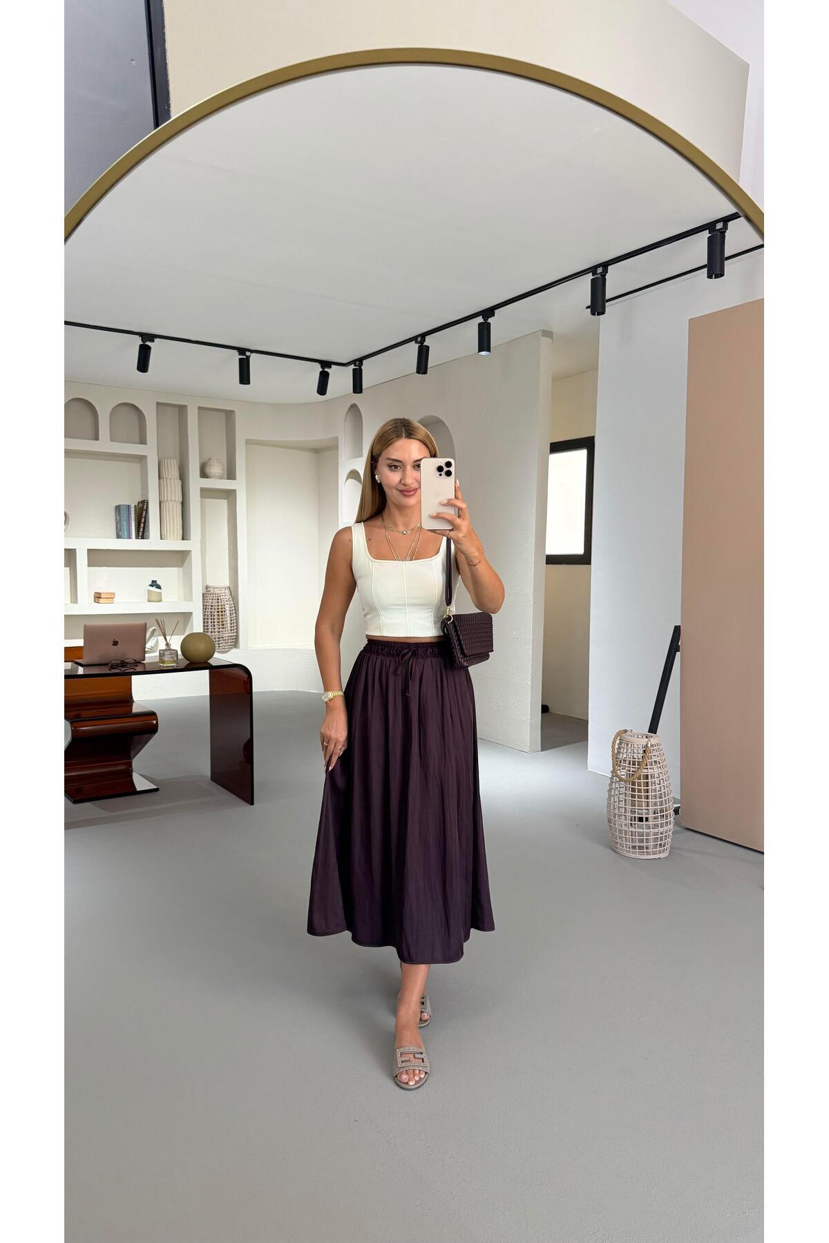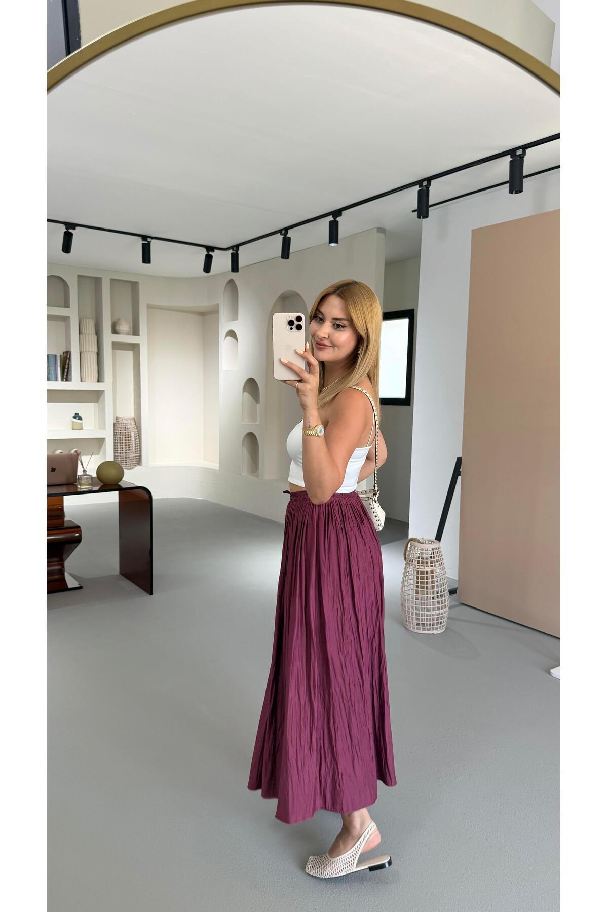 Bel Lastikli Kırışık Doku Saten Midi Mürdüm Etek Bel Lastikli Kırışık Doku Saten Midi Mürdüm Etek ETK-0229-MRD L