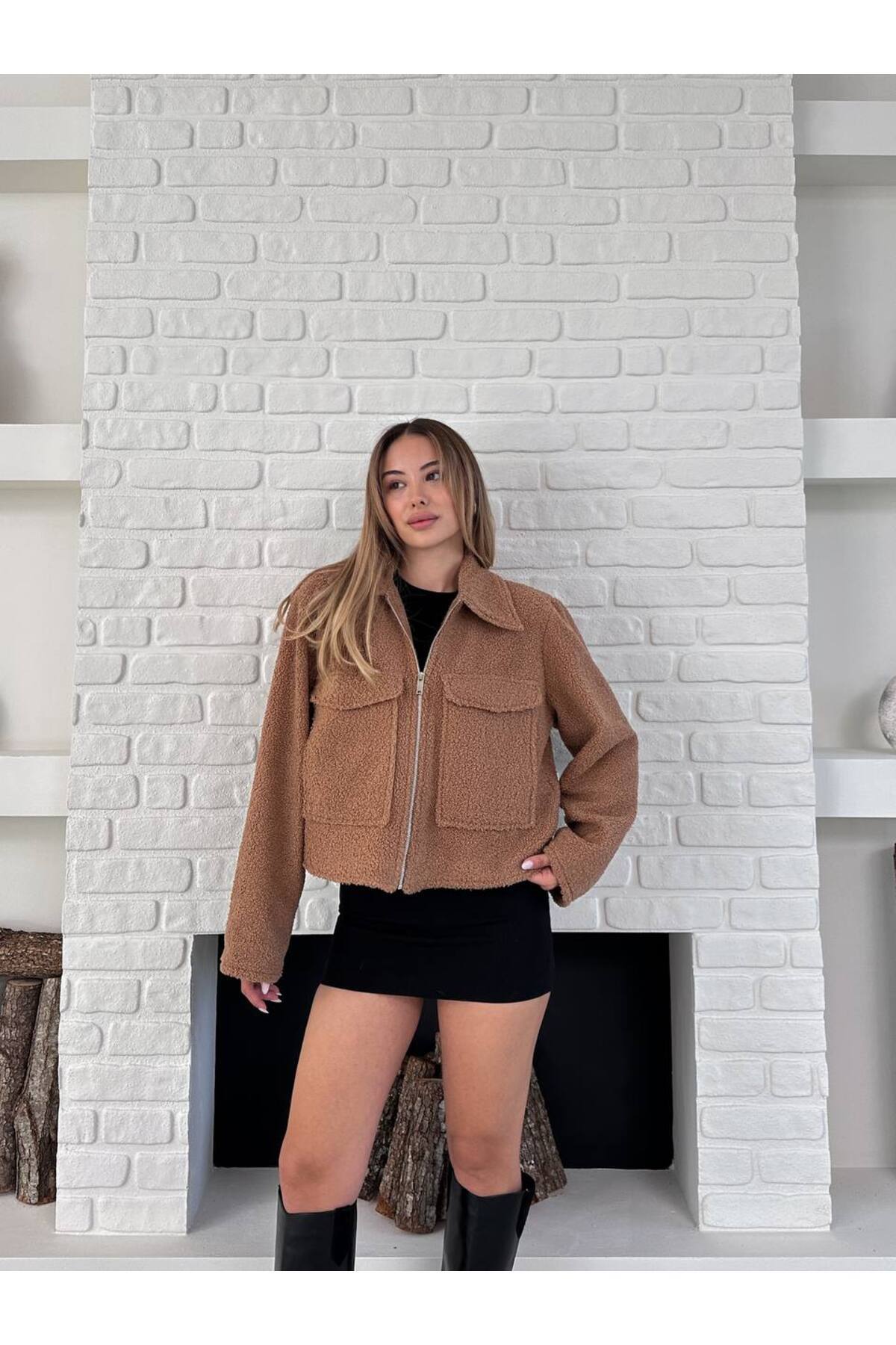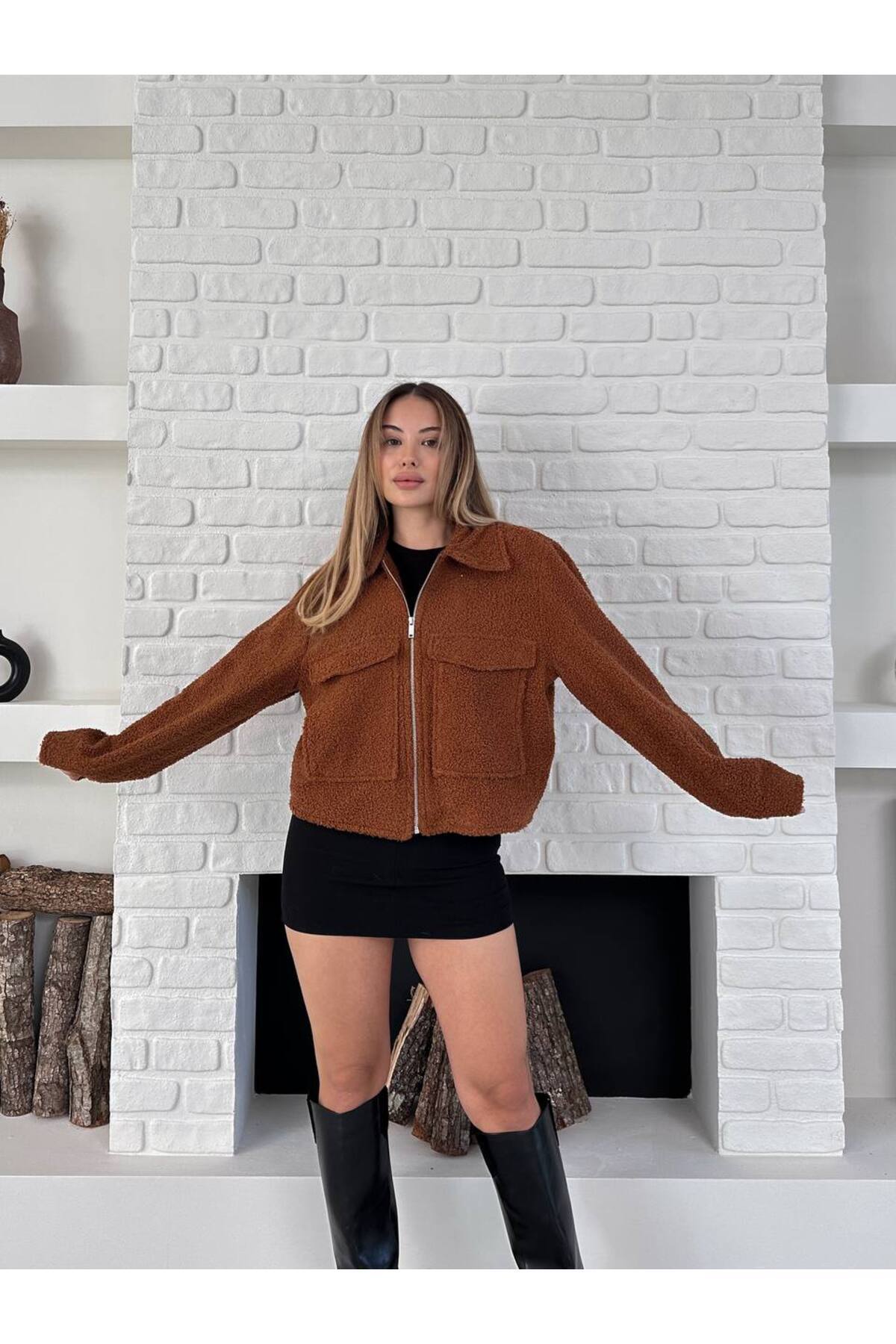Kadın Fermuar Detaylı Cepli Kısa Peluş Ceket Kadın Fermuar Detaylı Cepli Kısa Peluş Ceket Bella7002 L