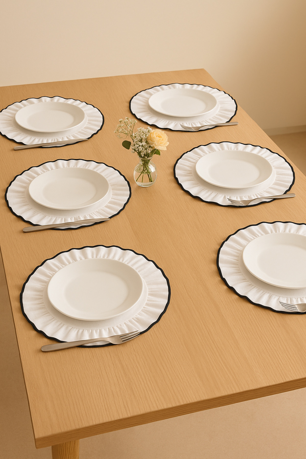 6'lı Yuvarlak Keten Amerikan Servis Seti – Beyaz, Siyah Biyeli Fırfır Kenar Tasarım 6'lı Yuvarlak Keten Amerikan Servis Seti – Beyaz, Siyah Biyeli Fırfır Kenar Tasarım T090498TKSL226 تک سایز