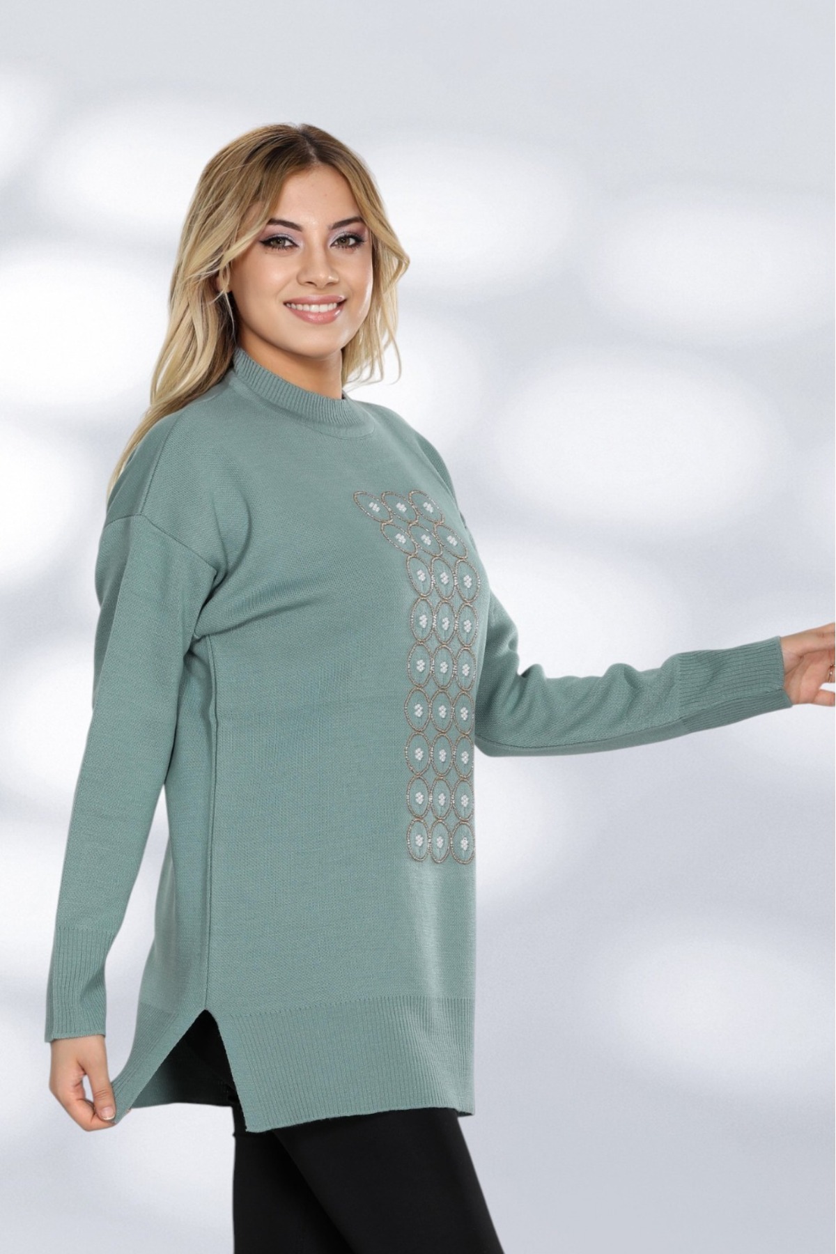 Işıltılı Taş Detaylı Uzun Triko Tunik Modern ve Rahat Kesim Işıltılı Taş Detaylı Uzun Triko Tunik Modern ve Rahat Kesim 1308 Standart