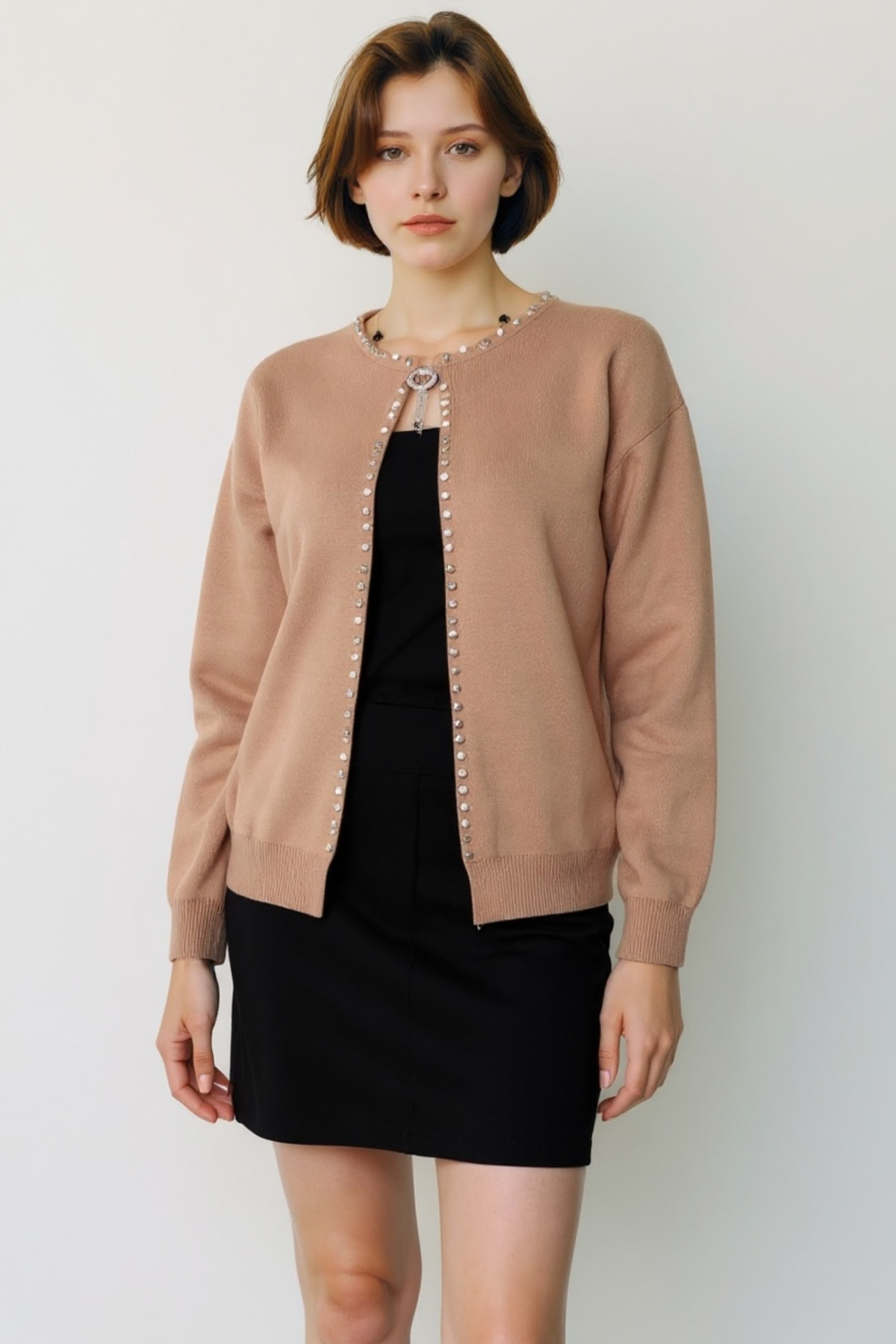 Modern Tarz Çift Sıra Düğme Detaylı Taş Süslemeli V Yaka Triko Hırka Modern Tarz Çift Sıra Düğme Detaylı Taş Süslemeli V Yaka Triko Hırka 1412 Standart