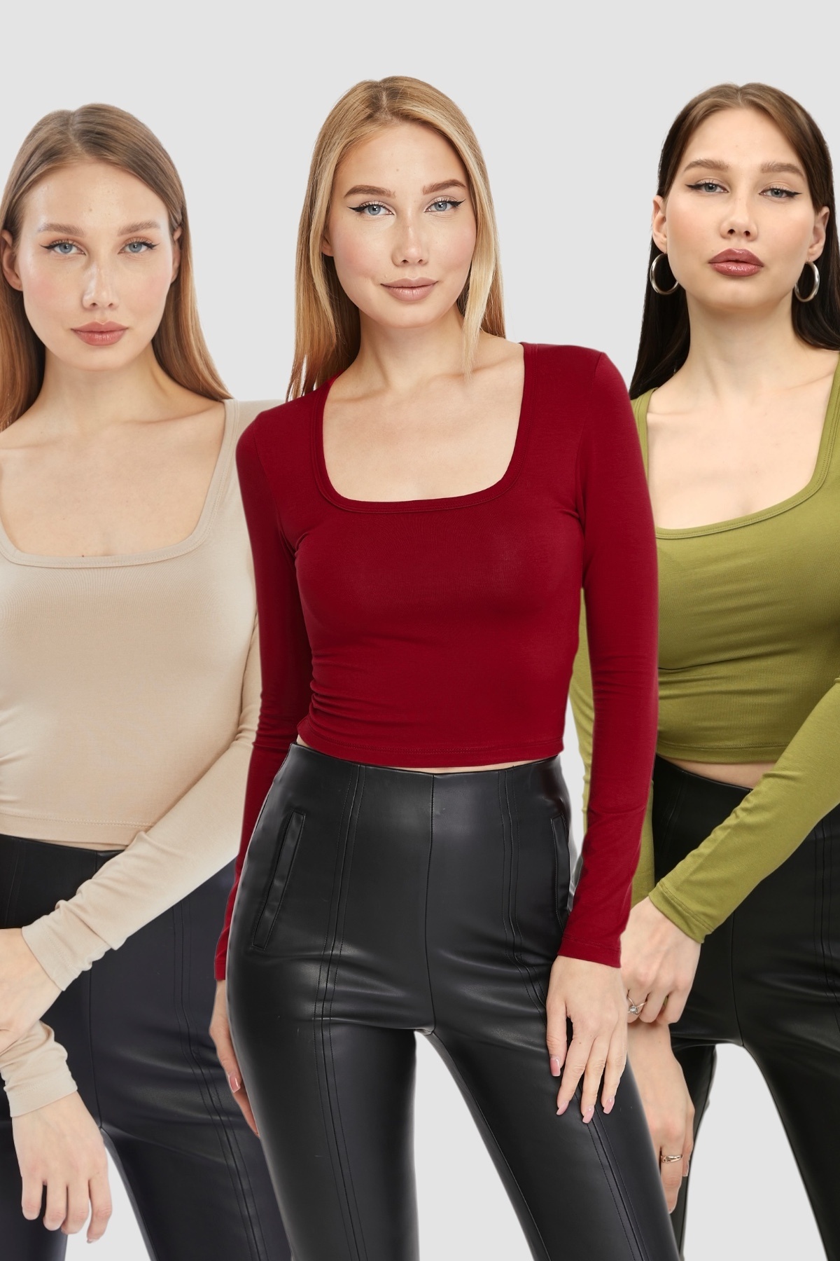 Kadın Beyaz Krem Kahverengi Kare Yaka 3'lü Crop Body Kadın Beyaz Krem Kahverengi Kare Yaka 3'lü Crop Body ENT09 L