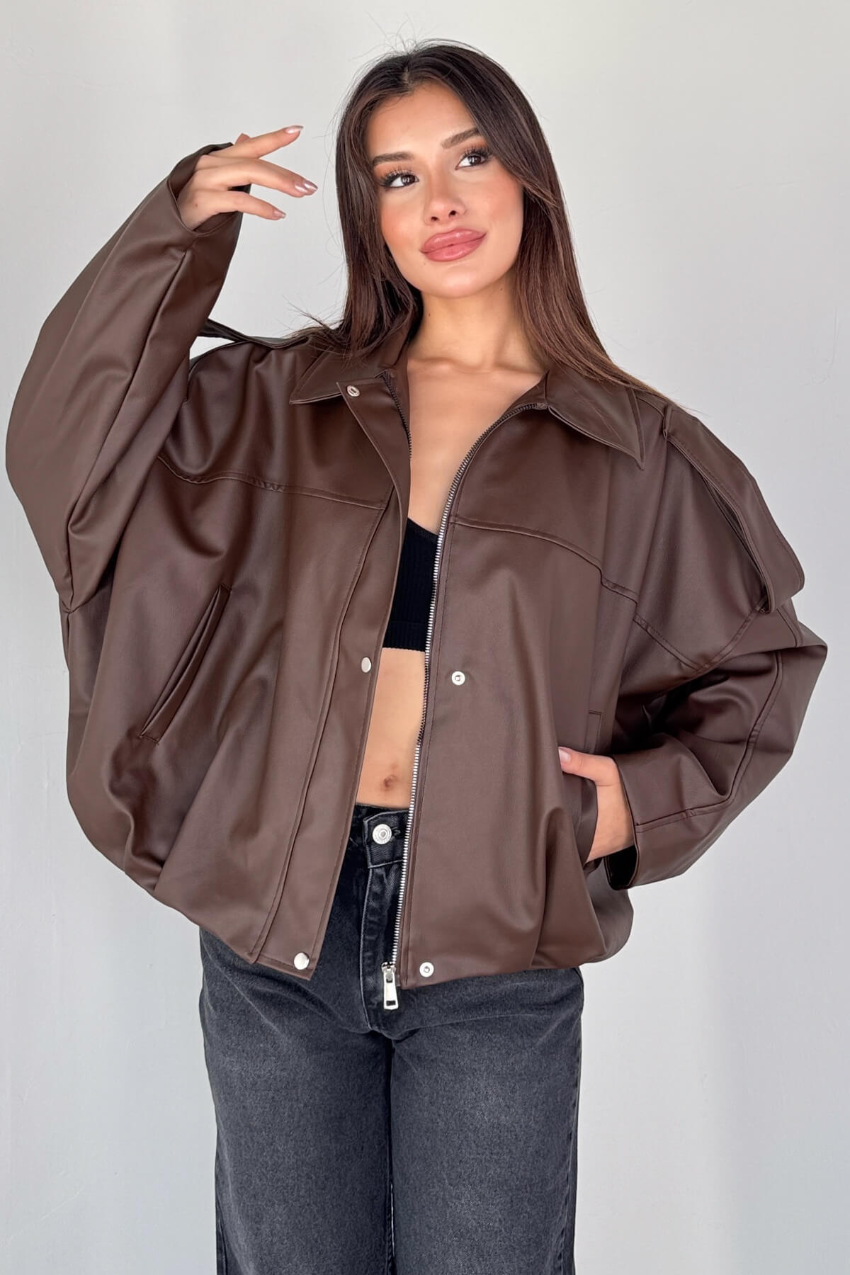 CKT-2016 Siyah Suni Deri Fermuarlı Bel Lastikli Cropped Model Ceket CKT-2016 Siyah Suni Deri Fermuarlı Bel Lastikli Cropped Model Ceket L
