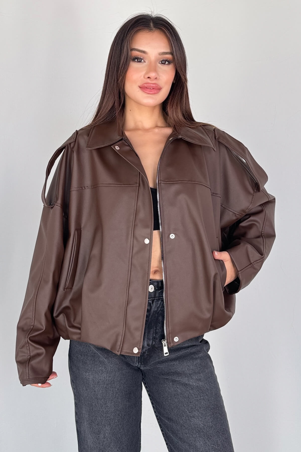 CKT-2020 Kahverengi Suni Deri Astarlı Fermuarlı ve Düğmeli Oversize Ceket CKT-2020 Kahverengi Suni Deri Astarlı Fermuarlı ve Düğmeli Oversize Ceket L