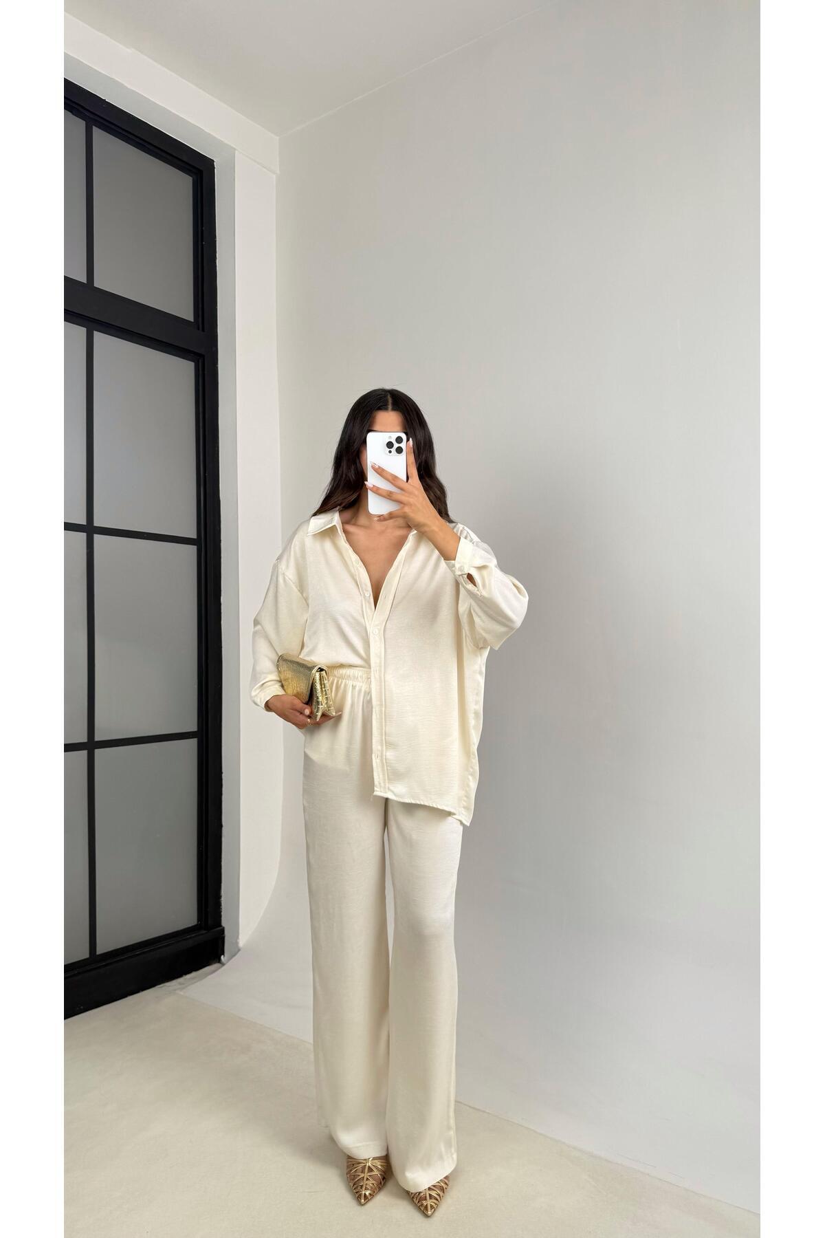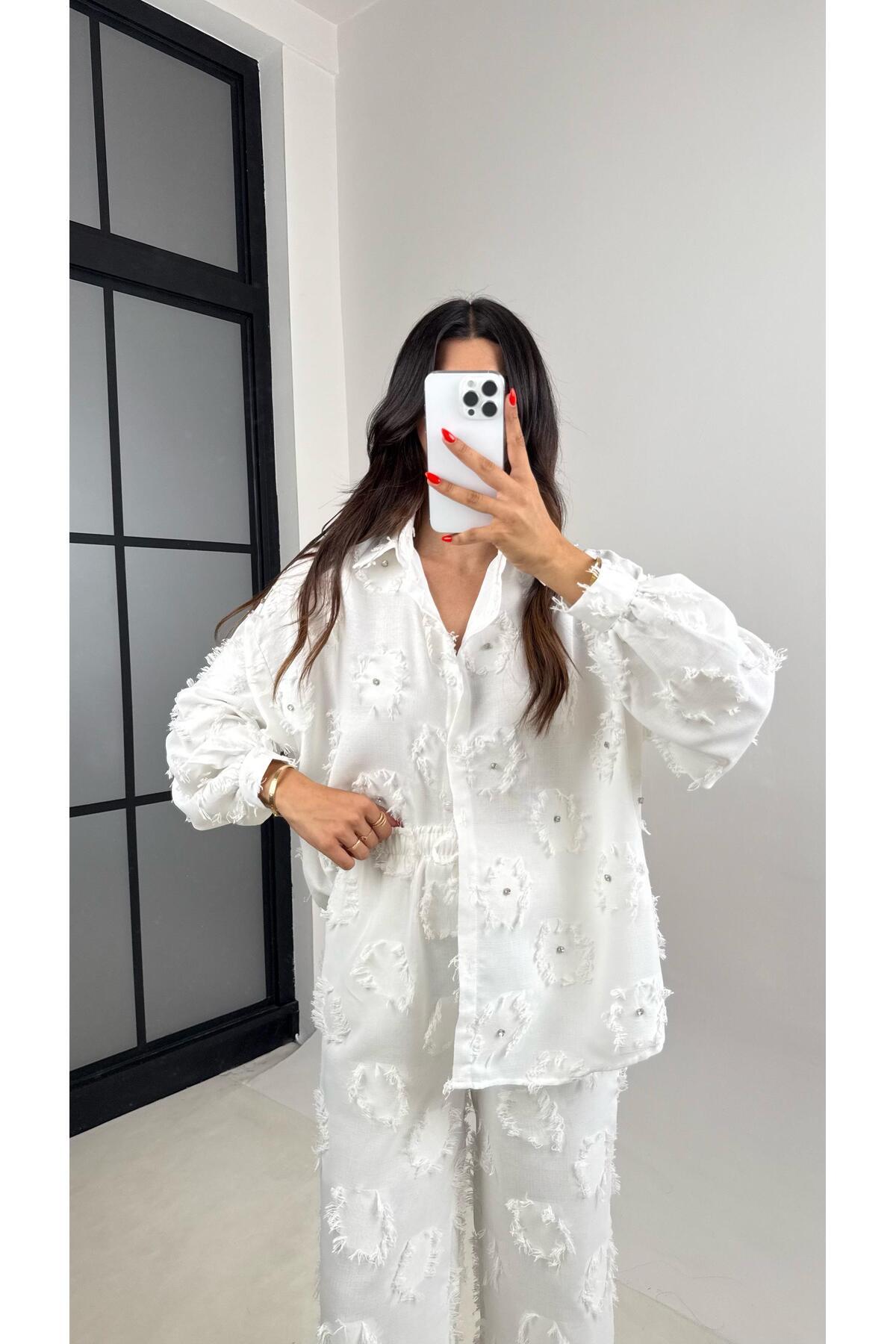 Beyaz Püskülü Taş Detaylı Gömlek Beli Lastikli Pantolon Tasarım Takım GAUS-004 Beyaz Püskülü Taş Detaylı Gömlek Beli Lastikli Pantolon Tasarım Takım GAUS-004 L