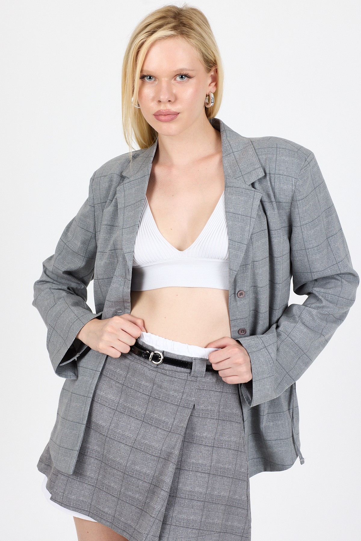 Şık Bağcıklı Kemer Detaylı Kareli Kadın Ceket – Klasik Yaka, Zarif ve Zamansız, Gri Şık Bağcıklı Kemer Detaylı Kareli Kadın Ceket – Klasik Yaka, Zarif ve Zamansız, Gri EKOSECEKET001 L