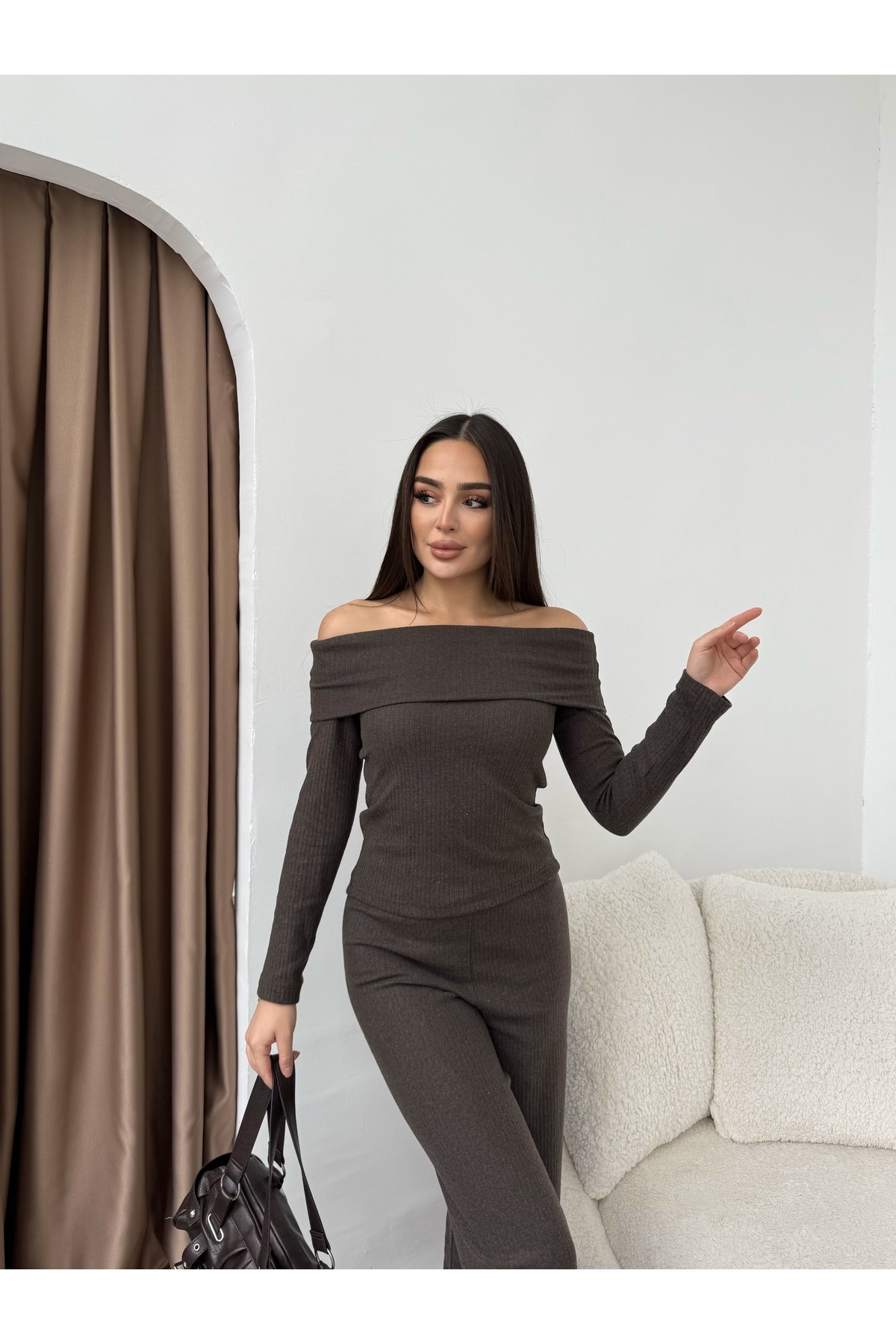 Kadın Madonna Yaka Şardonlu Geniş Fitilli Esnek Bluz ve Pantolon Takım Kadın Madonna Yaka Şardonlu Geniş Fitilli Esnek Bluz ve Pantolon Takım 0032 XL