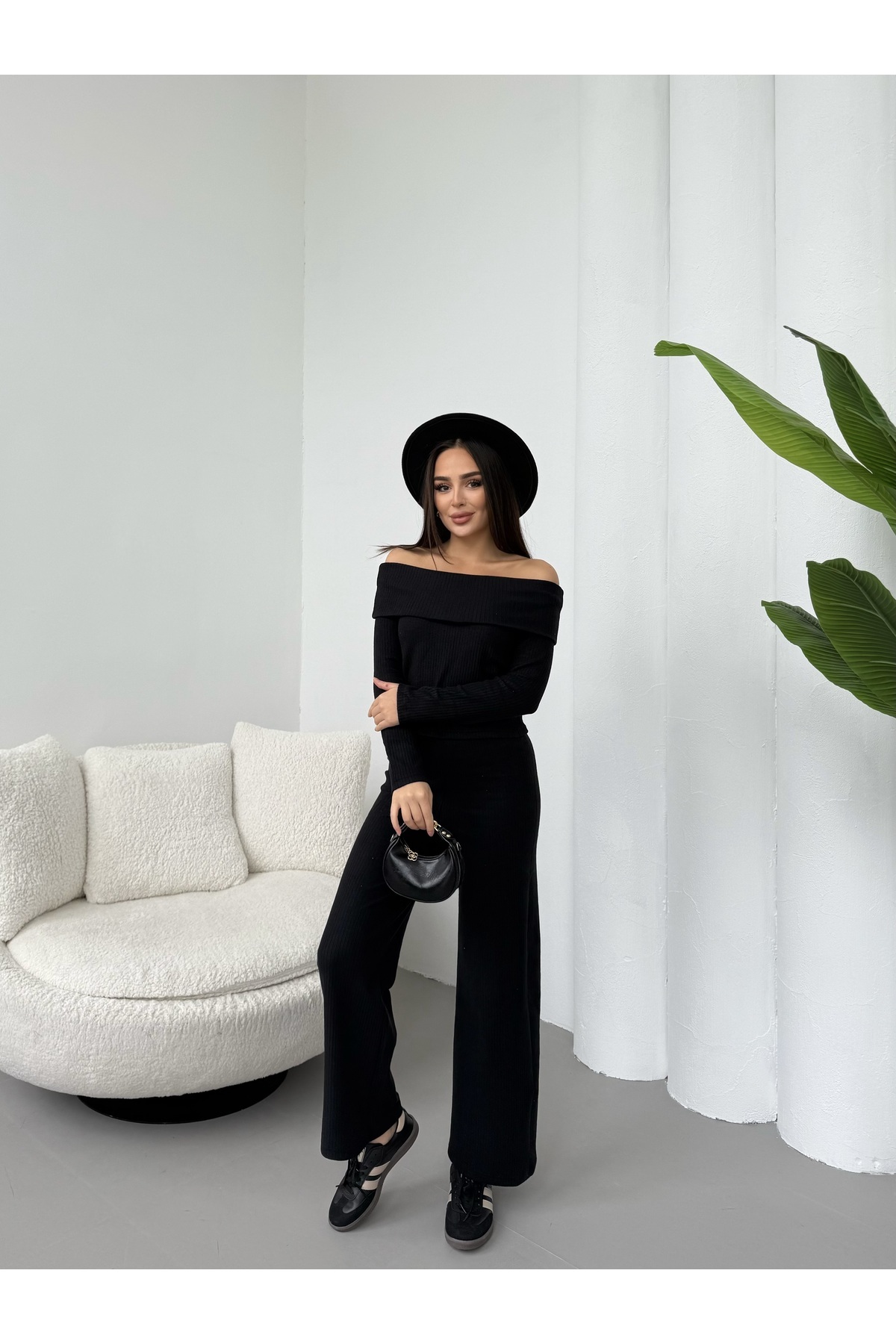 Kadın Madonna Yaka Şardonlu Geniş Fitilli Esnek Bluz ve Pantolon Takım Kadın Madonna Yaka Şardonlu Geniş Fitilli Esnek Bluz ve Pantolon Takım 0032 XL