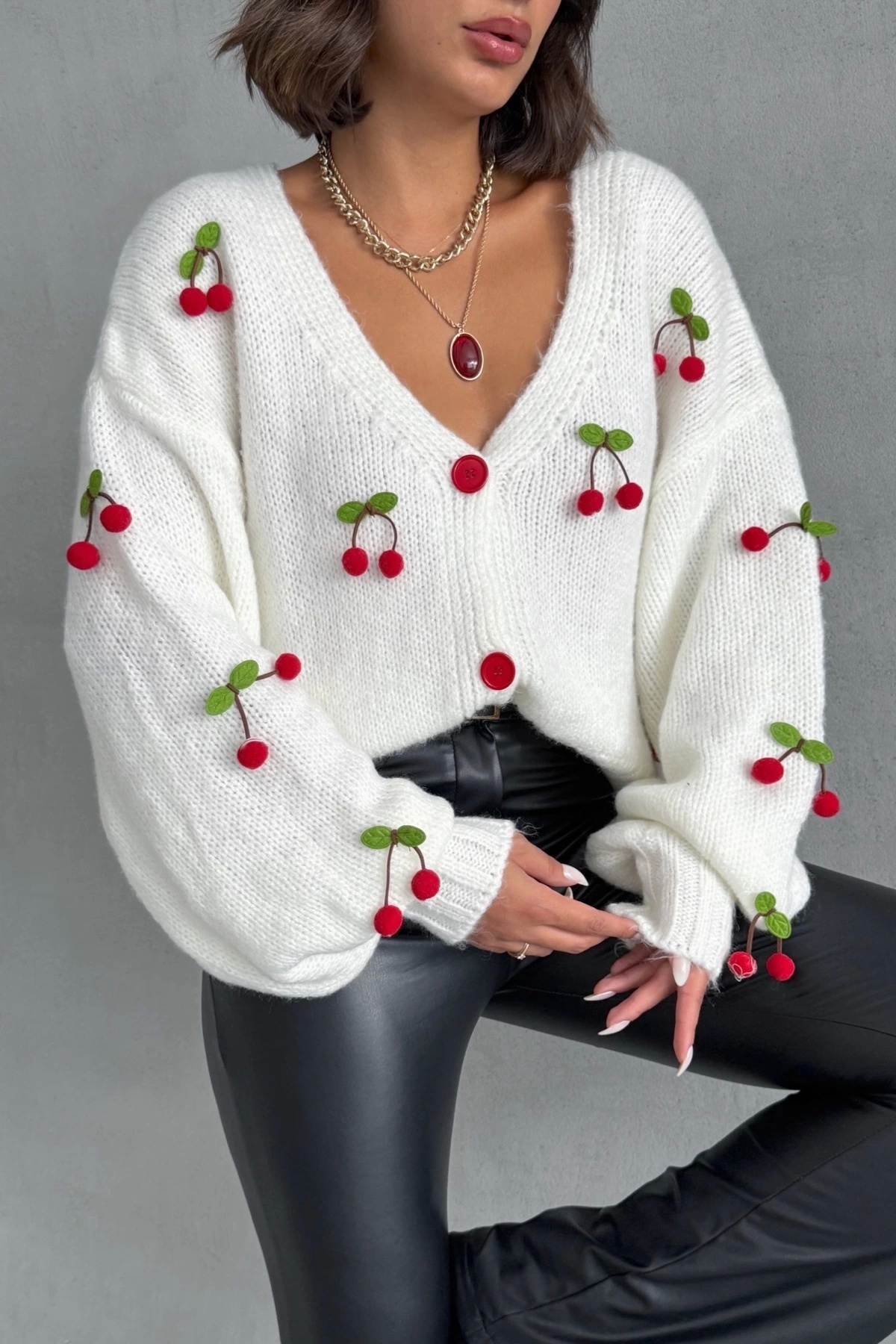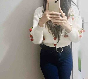 Kadın Beyaz Kiraz Aksesuarlı Triko Hırka Kadın Beyaz Kiraz Aksesuarlı Triko Hırka LSN0201 Standart