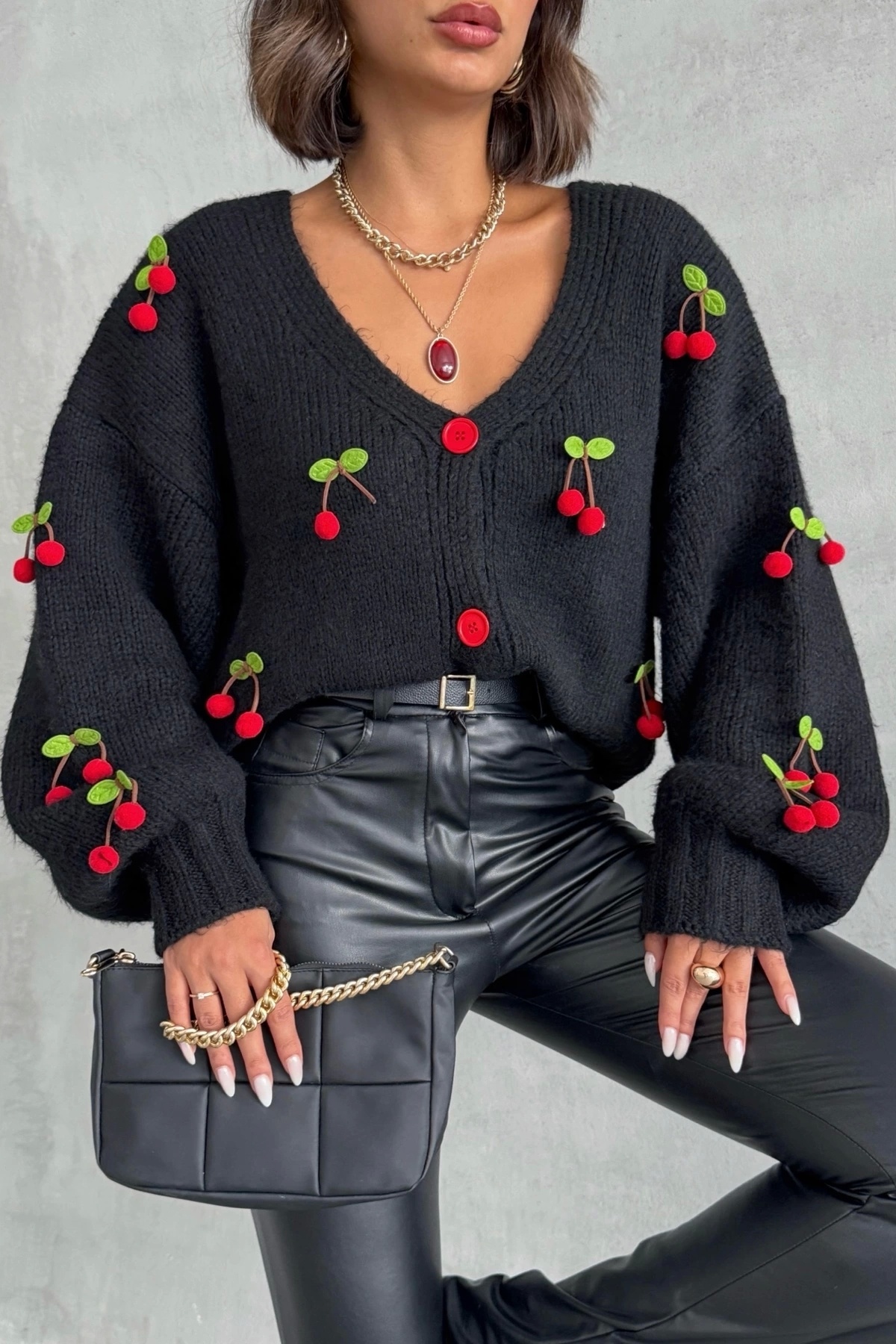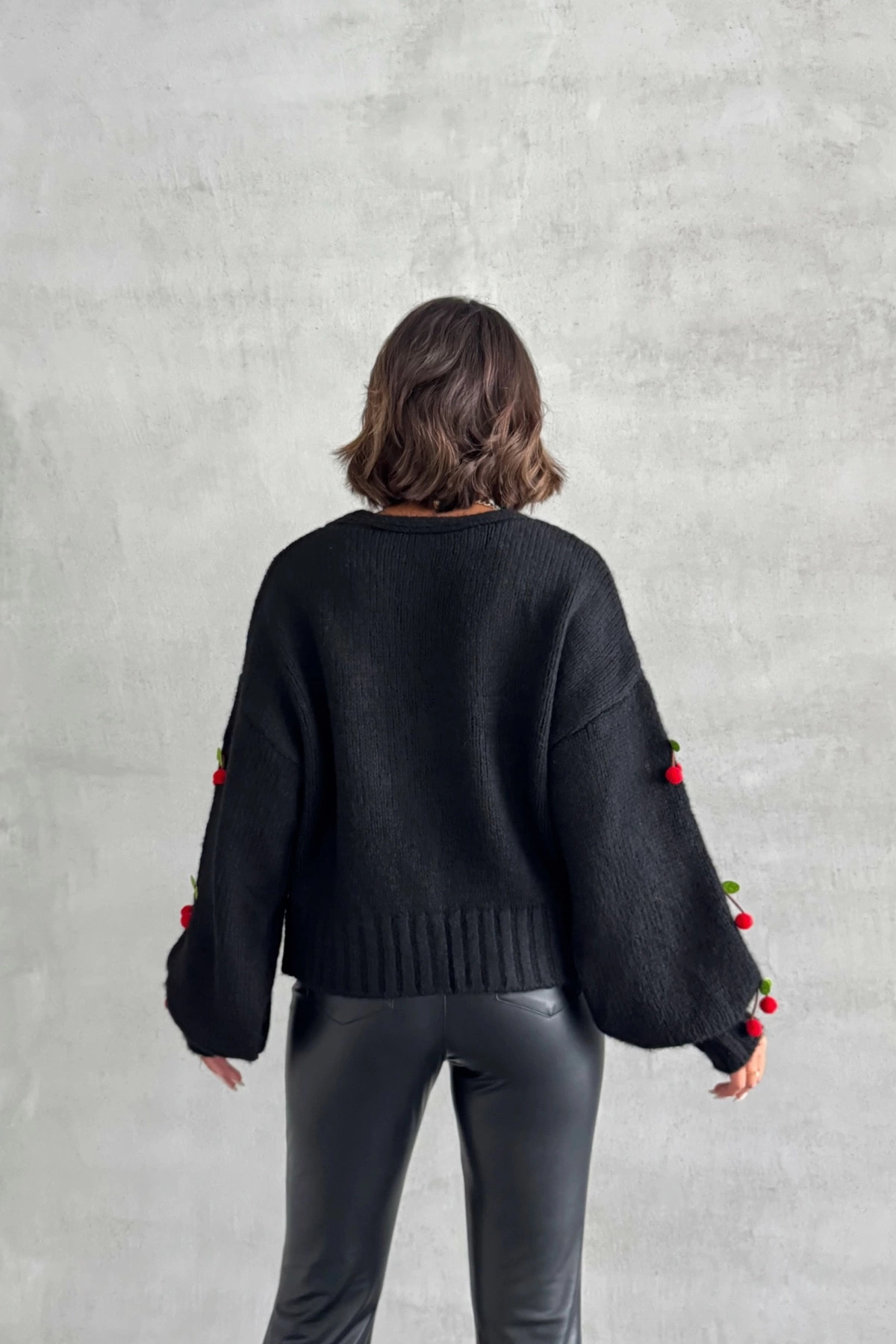 Kadın Siyah Kiraz Aksesuarlı Triko Hırka Kadın Siyah Kiraz Aksesuarlı Triko Hırka LSN0201 Standart