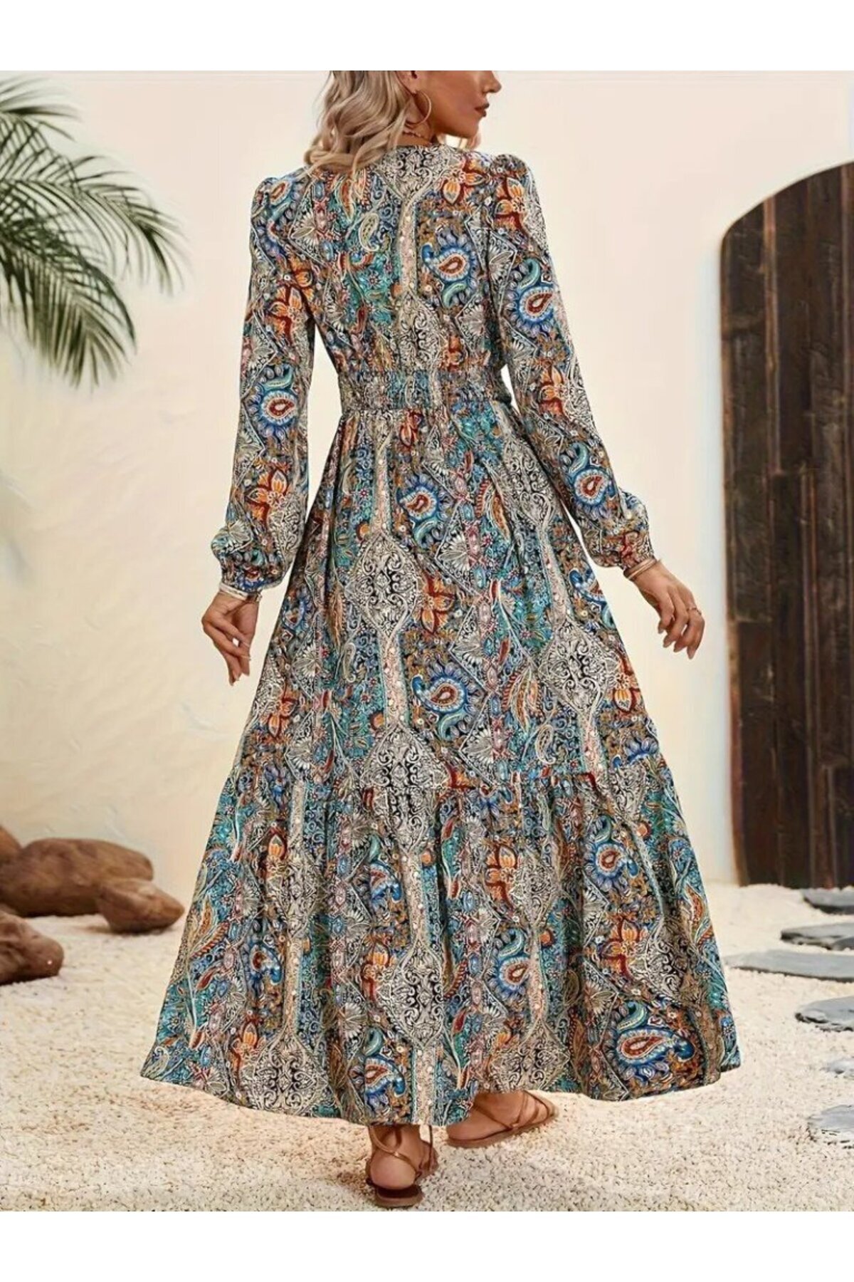 Kadın Yakası Bağcıklı Uzun Kollu Beli Lastikli Desenli Uzun Süprem Elbise Kadın Yakası Bağcıklı Uzun Kollu Beli Lastikli Desenli Uzun Süprem Elbise 61655 2XL-3XL