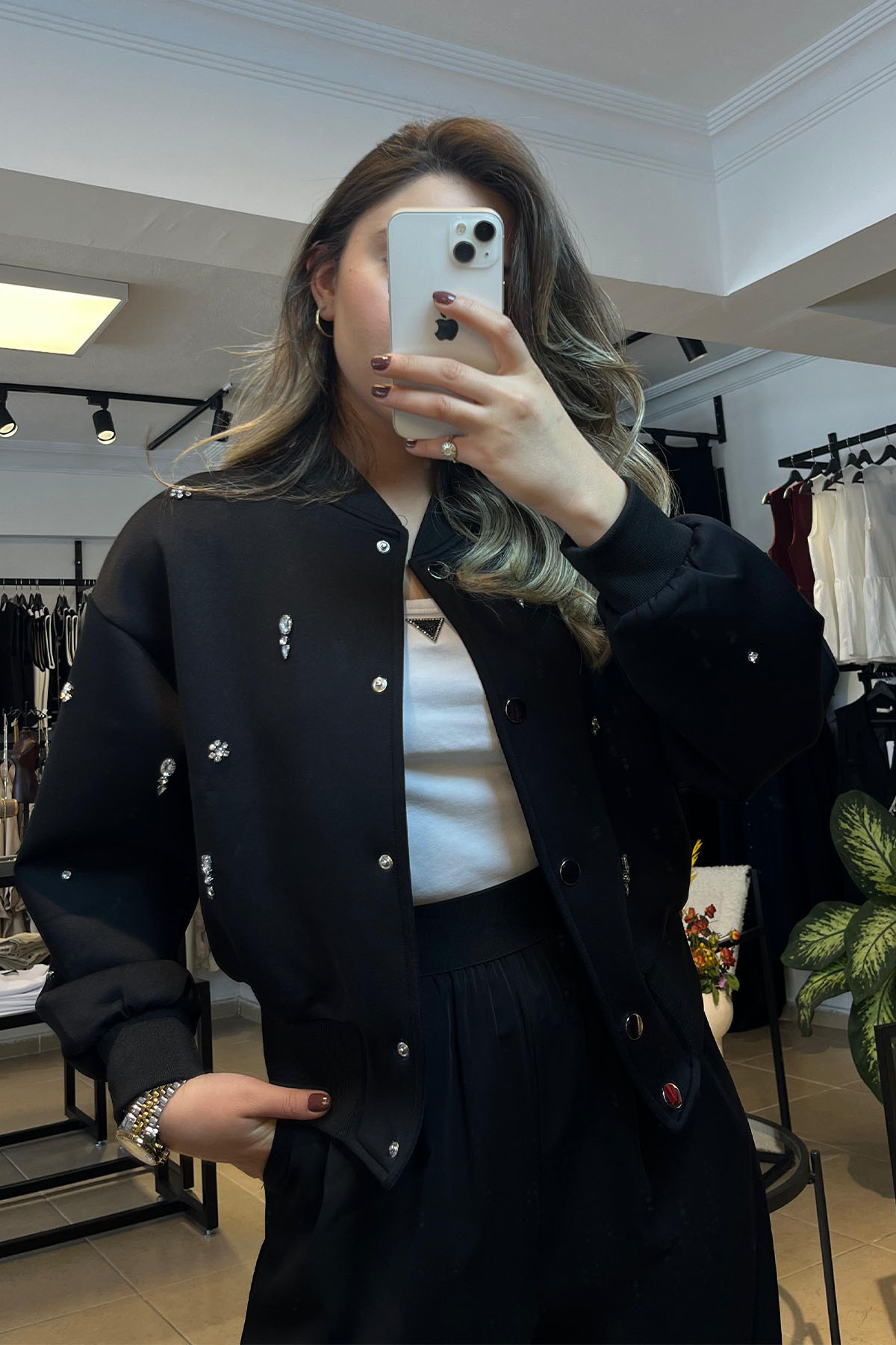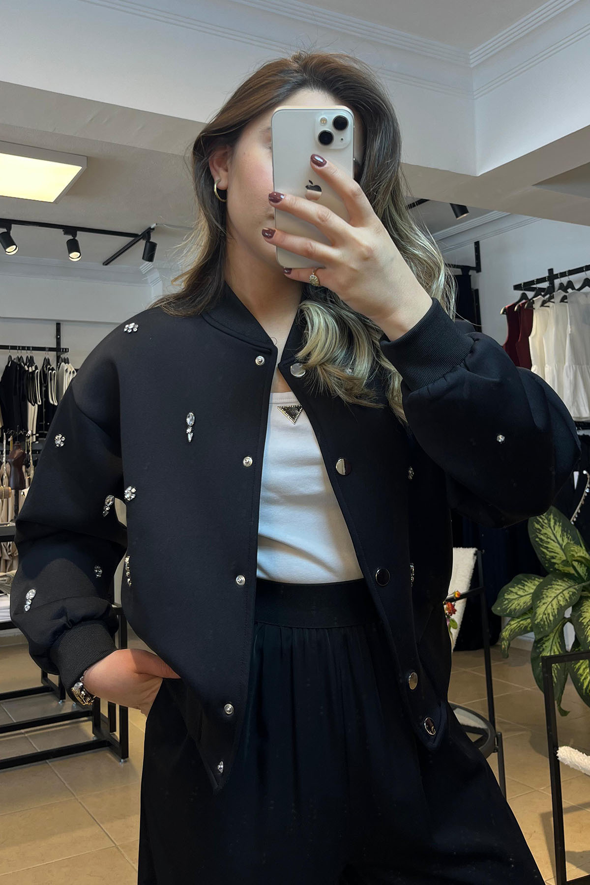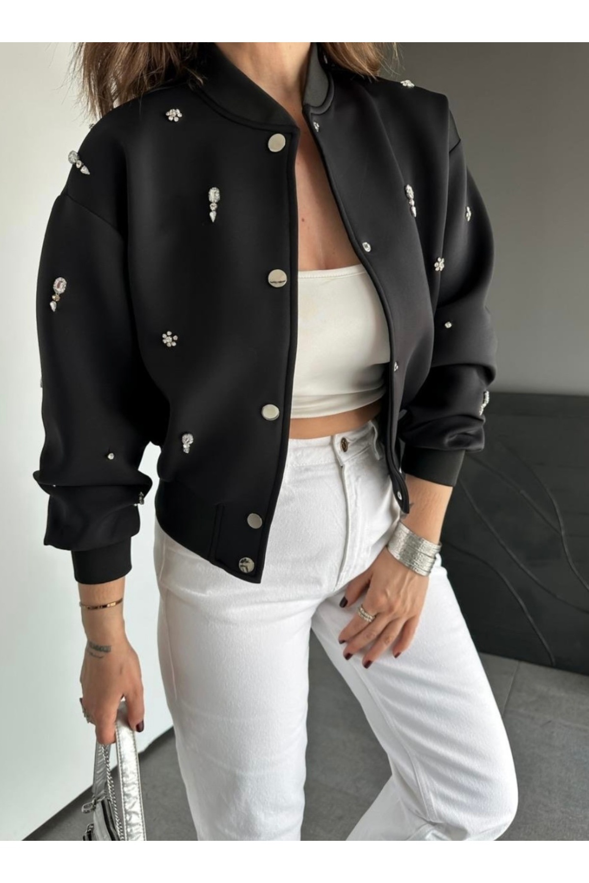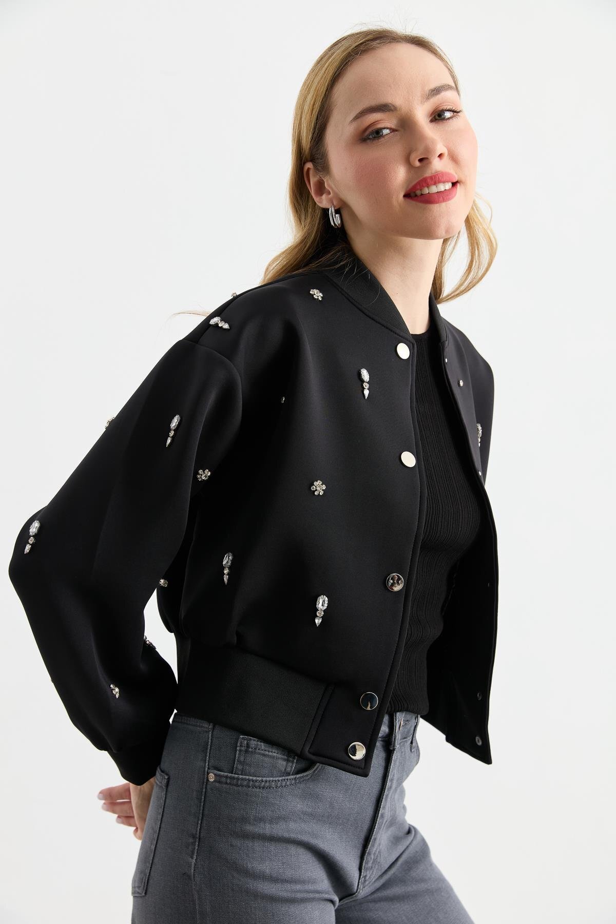 Taş Detaylı Düğmeli Bomber Ceket Taş Detaylı Düğmeli Bomber Ceket 422511429 XL