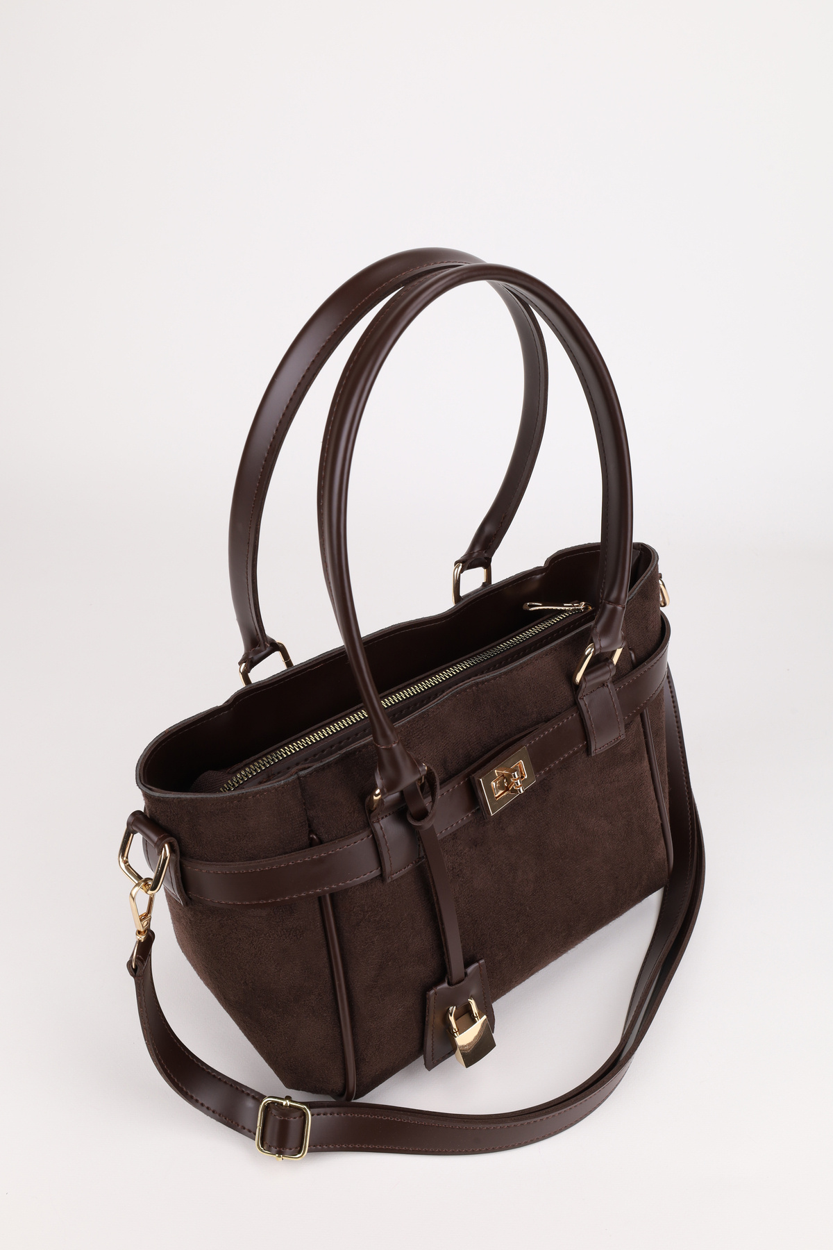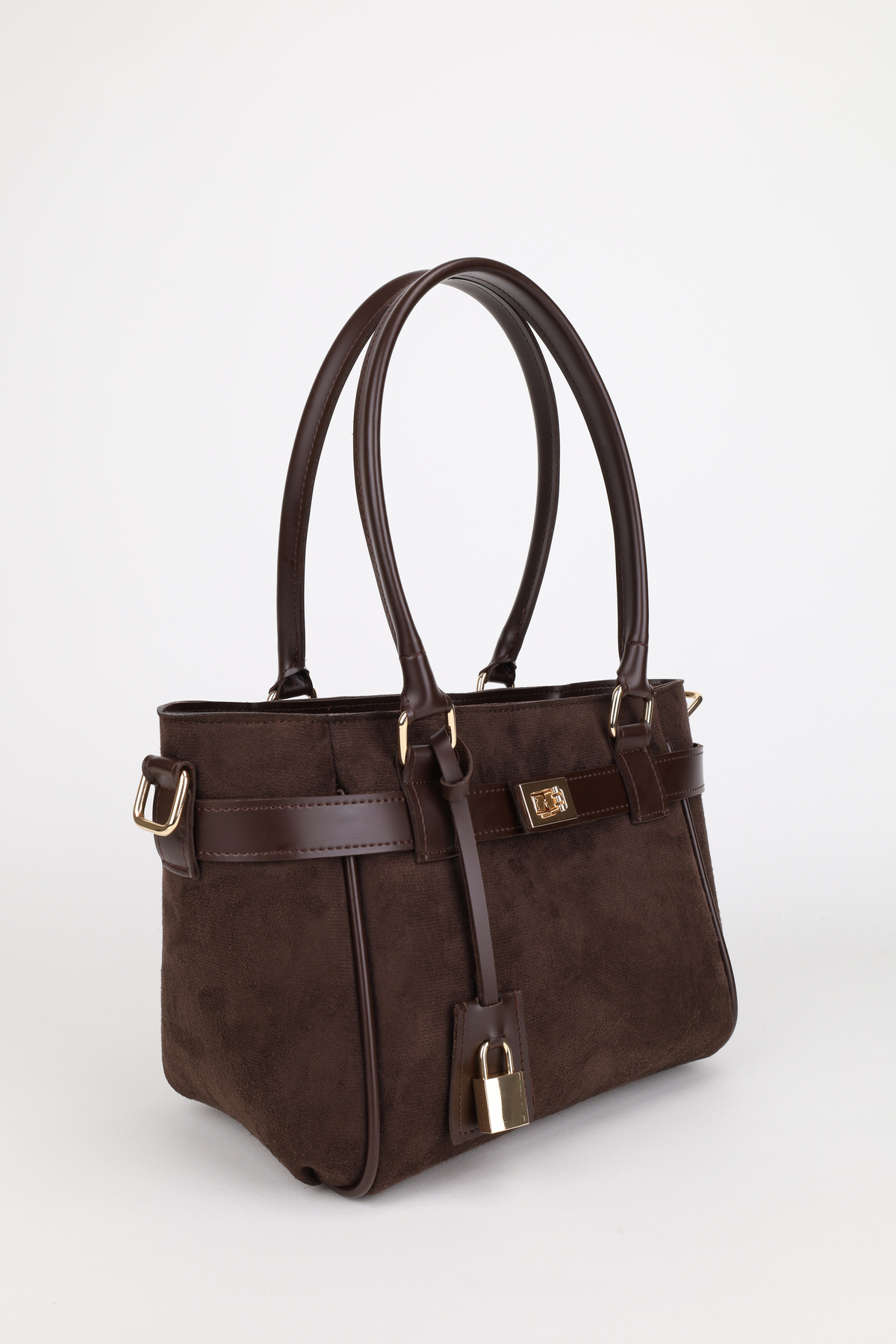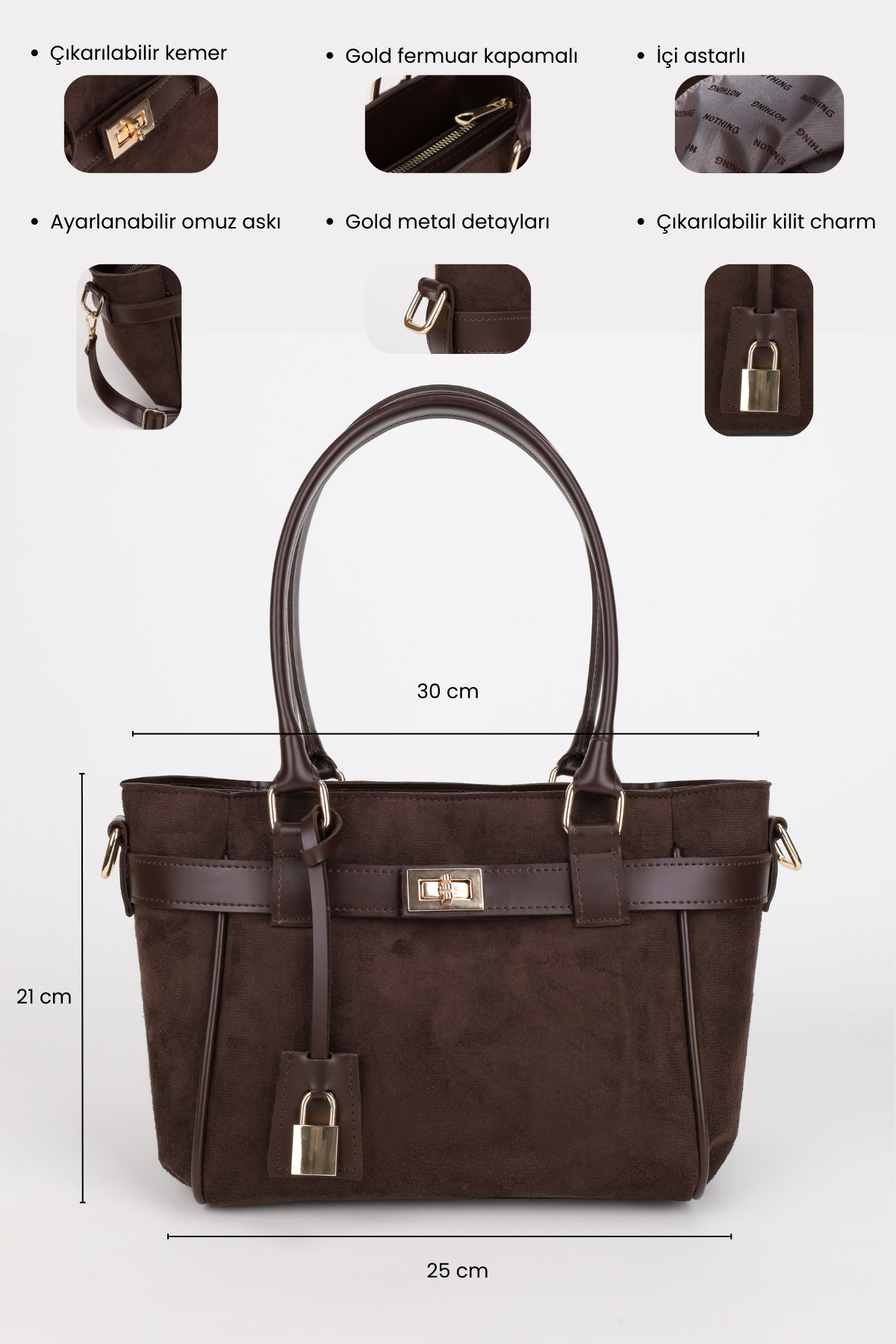 Kadın Süet Kahve Kemer ve Kilit Charm Detaylı Fermuar Kapamalı El ve Omuz Çantası Lotus Kadın Süet Kahve Kemer ve Kilit Charm Detaylı Fermuar Kapamalı El ve Omuz Çantası Lotus Lotus0001 Standart