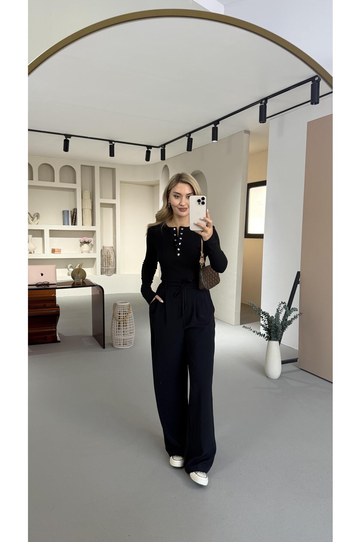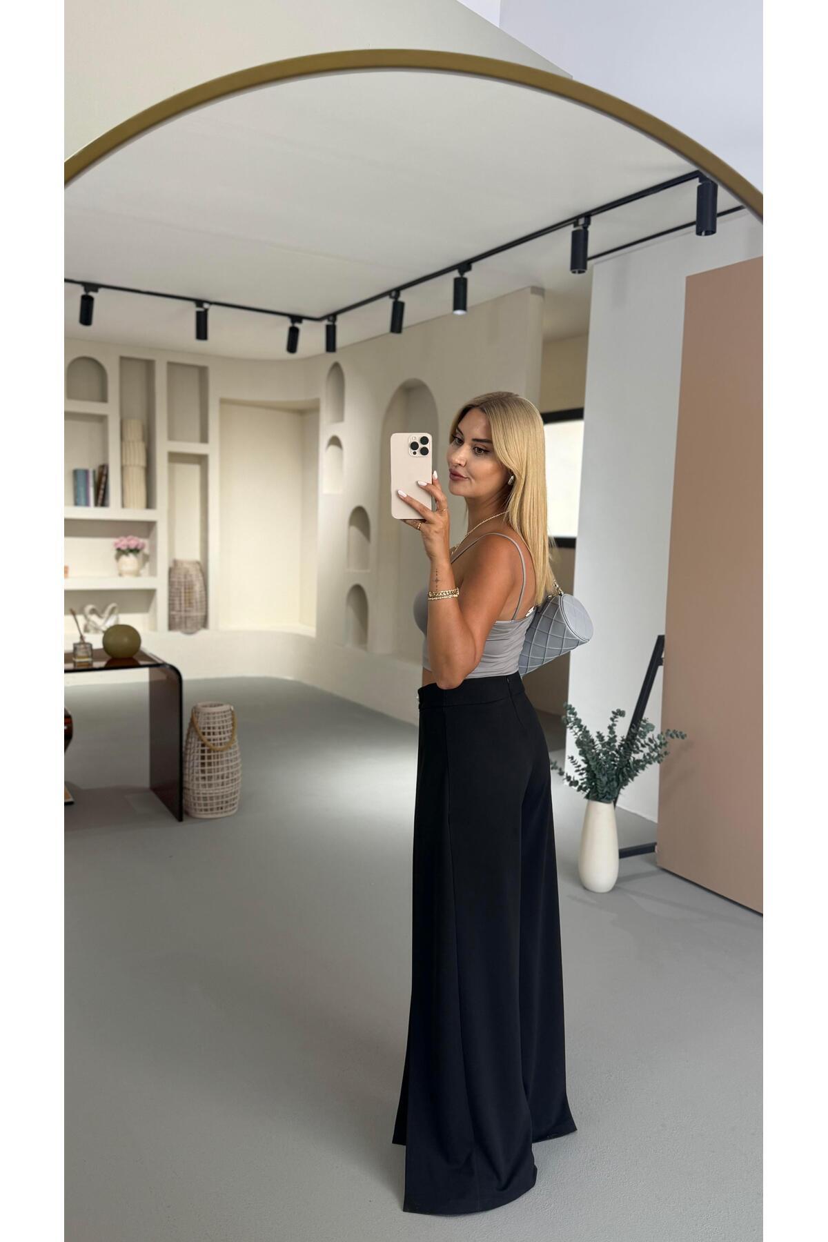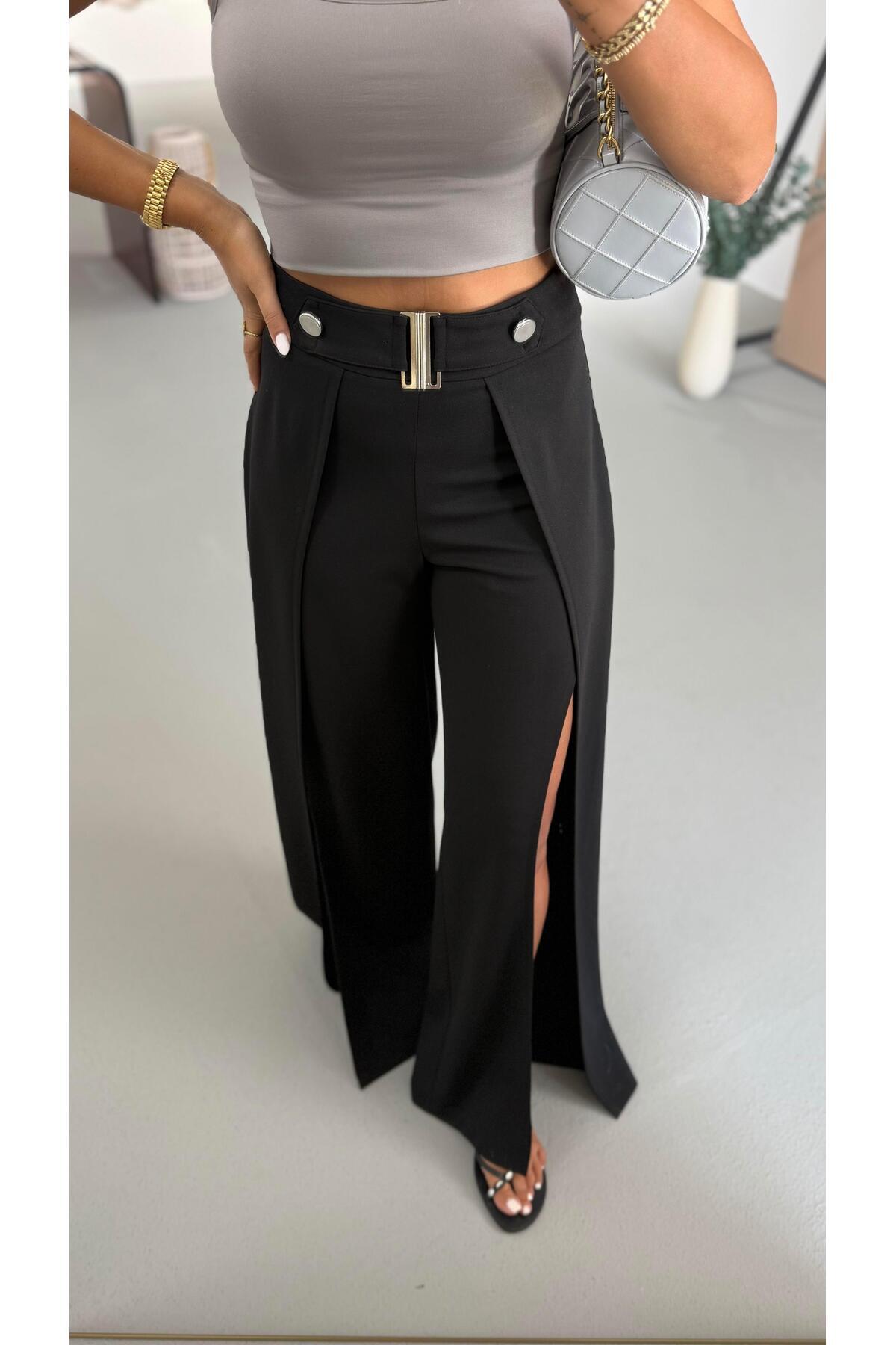 Kemer Detay Yırtmaçlı Siyah Bol Pantolon Kemer Detay Yırtmaçlı Siyah Bol Pantolon PNT-0554-SYH 42