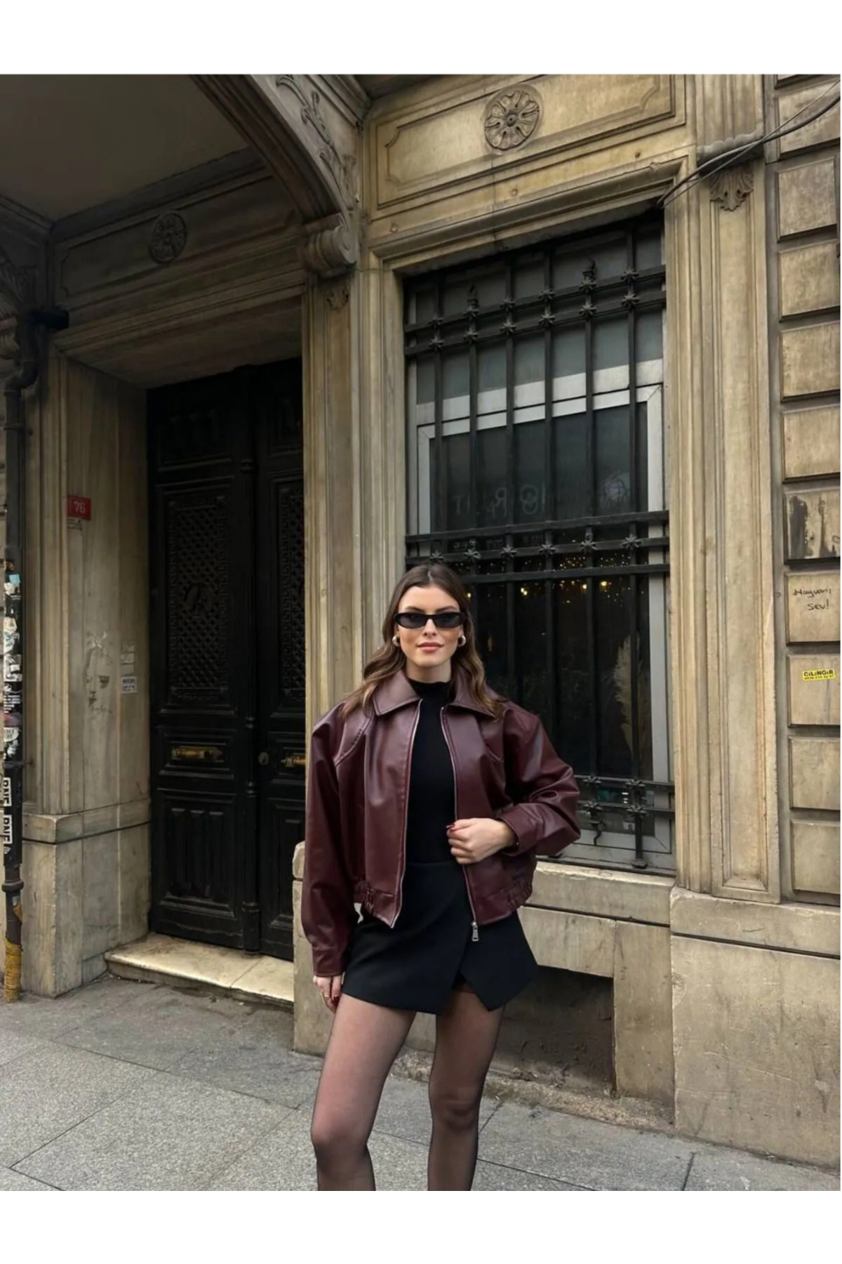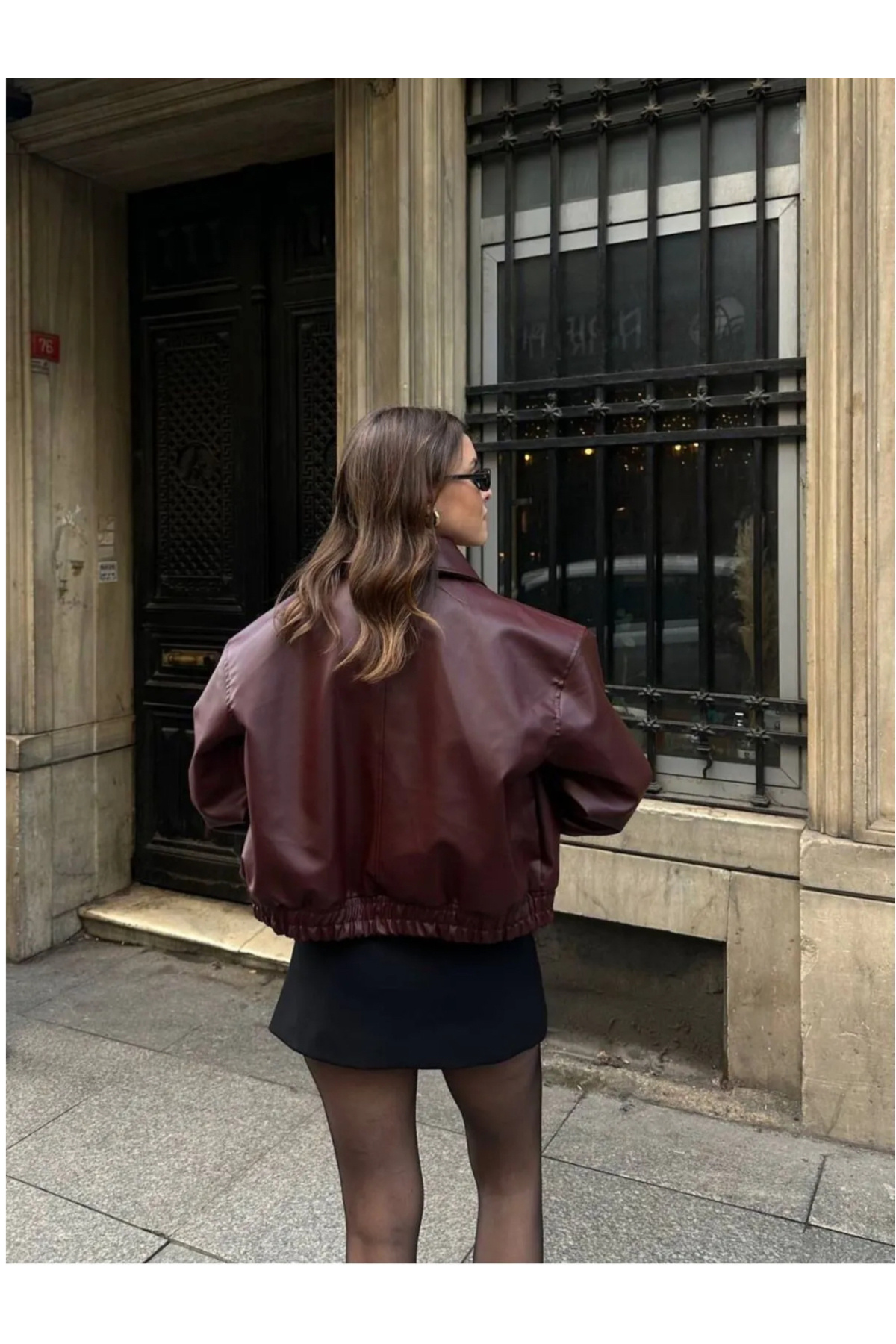 Bordo Kısa Kesim Oversize Deri Look Kadın Ceket Bordo Kısa Kesim Oversize Deri Look Kadın Ceket 18321832 L
