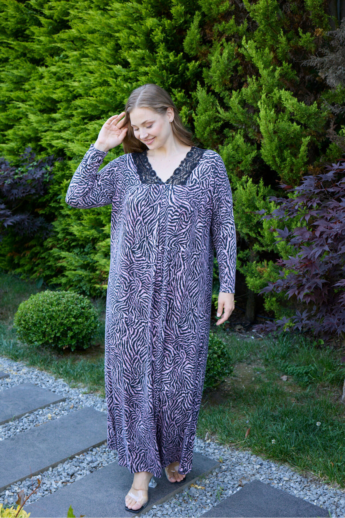 Açık Mor Zebra Desenli Yün Viskon Dantel Detaylı Uzun Kol Elbise Açık Mor Zebra Desenli Yün Viskon Dantel Detaylı Uzun Kol Elbise 1005 5XL
