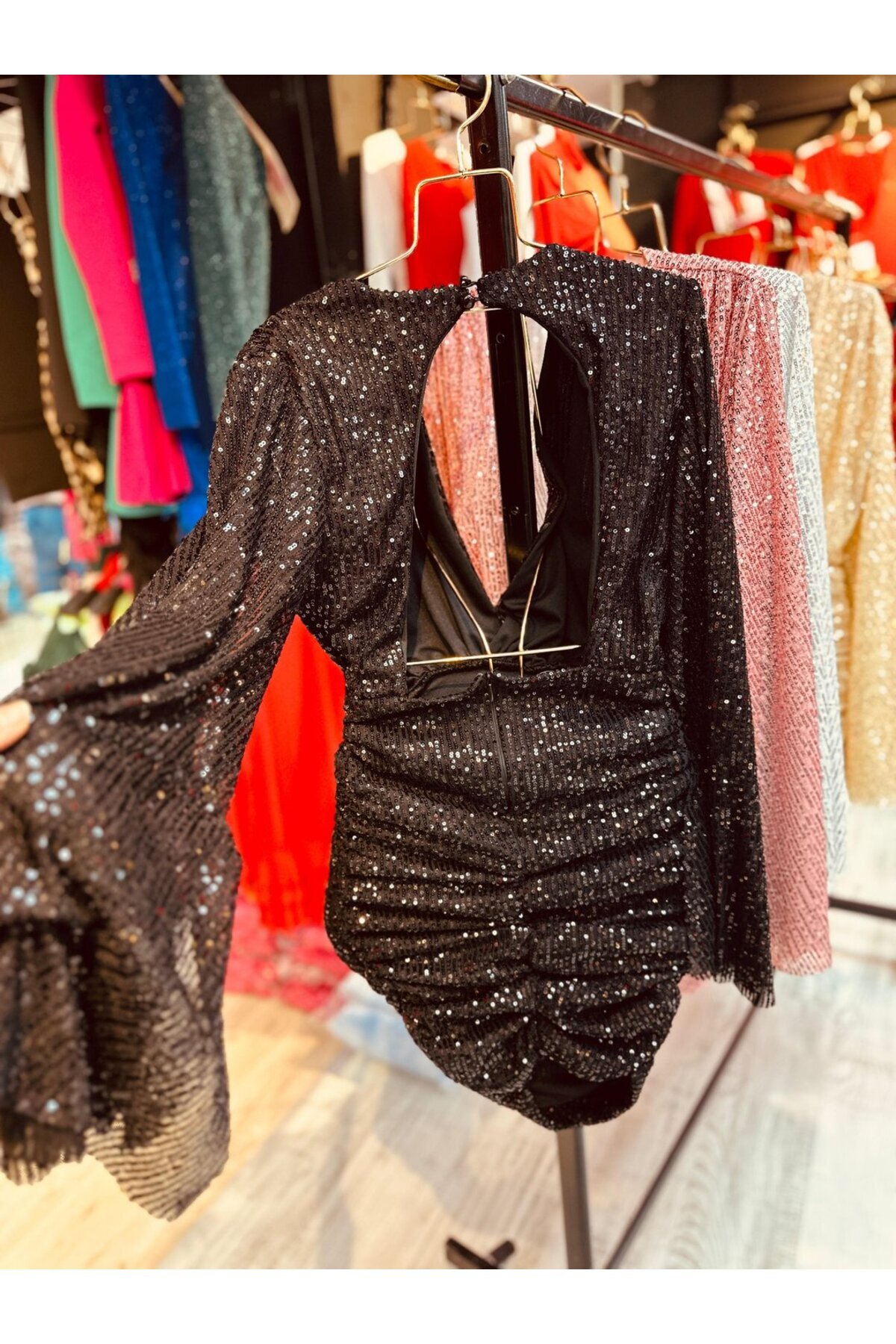Payet yarasa kol mini büzgülü astarlı fermuarlı elbise Payet yarasa kol mini büzgülü astarlı fermuarlı elbise 2765 L