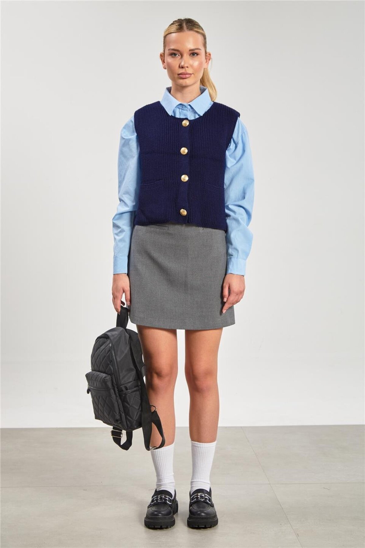 Kadın Cepli Düğmeli Triko Yelek - Lacivert Kadın Cepli Düğmeli Triko Yelek - Lacivert 274-25K11001 Standart