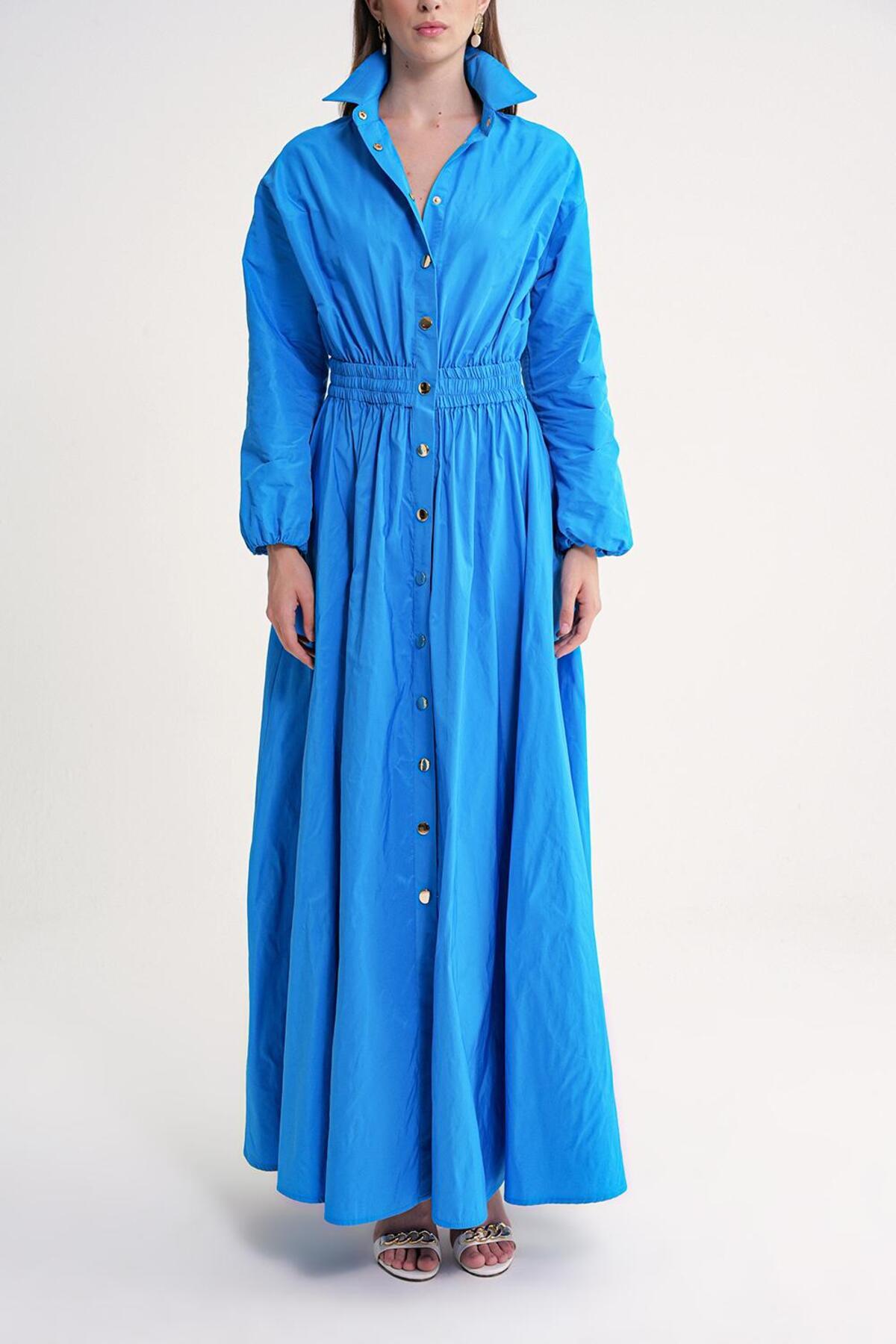 Mavi Lastik ve çıtçıt detaylı uzun gömlek elbise 94627 Mavi Lastik ve çıtçıt detaylı uzun gömlek elbise 94627 M18251094627 L