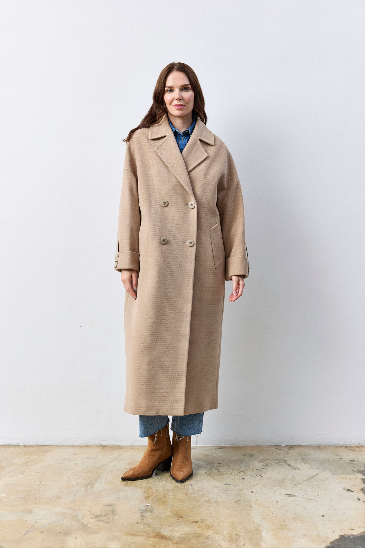 Oversize Açık Bej Uzun Kaban Kuşaklı Kendinden Dokulu Kumaş Oversize Açık Bej Uzun Kaban Kuşaklı Kendinden Dokulu Kumaş 32754-İR-K-N 44