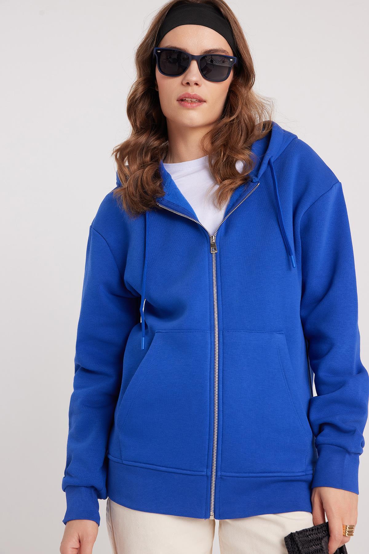 Kadın Relax Fit Rahat Kesim Pamuklu İçi Polarlı Çift Cepli Fermuarlı Sax Mavi Kapüşonlu Sweatshirt Kadın Relax Fit Rahat Kesim Pamuklu İçi Polarlı Çift Cepli Fermuarlı Sax Mavi Kapüşonlu Sweatshirt SW250031 L