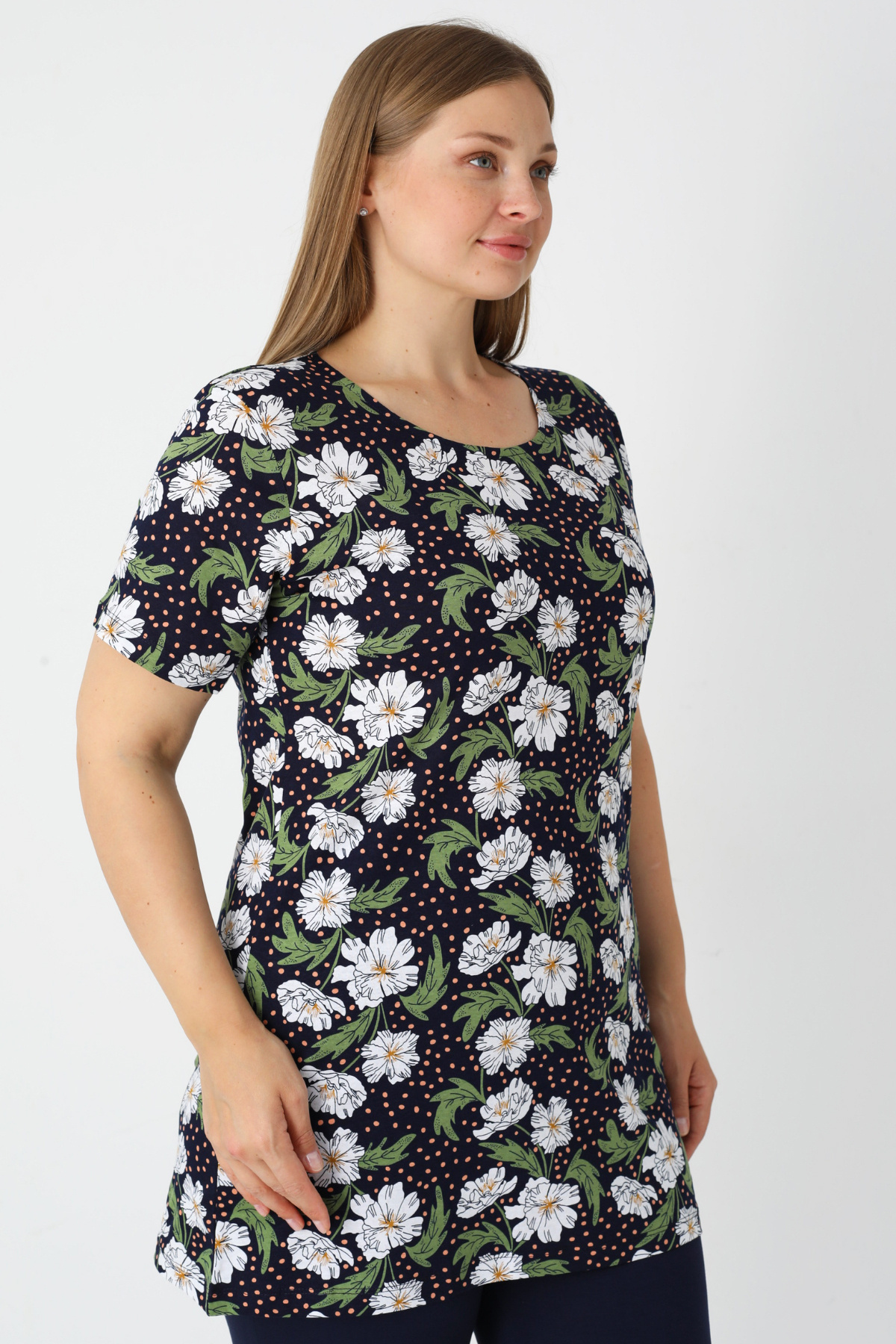 Kadın Büyük Beden Desenli Kısa Kollu Pamuklu T-Shirt Kadın Büyük Beden Desenli Kısa Kollu Pamuklu T-Shirt 2050 4XL