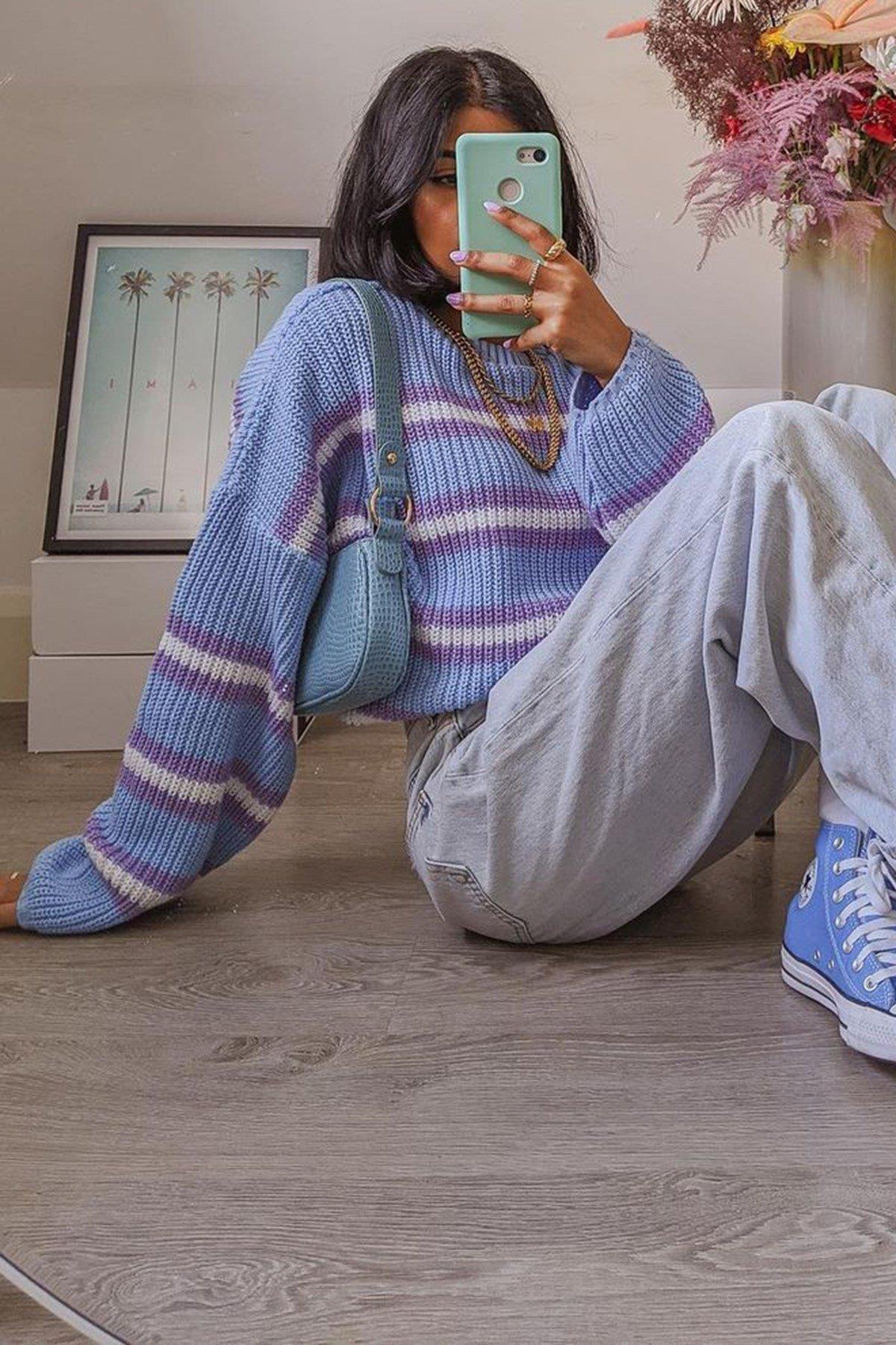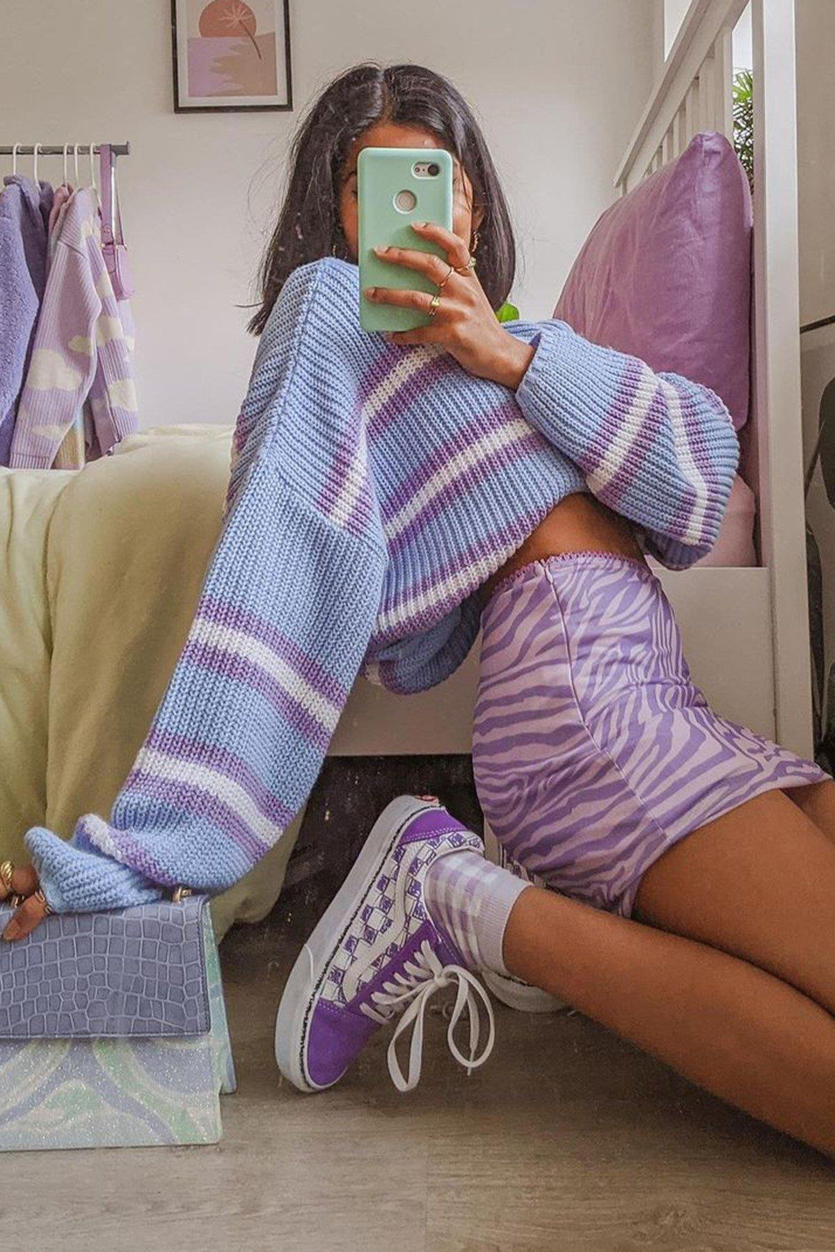 Lila Çizgili Triko Kadın Kazak SH293 Lila Çizgili Triko Kadın Kazak SH293 Standart