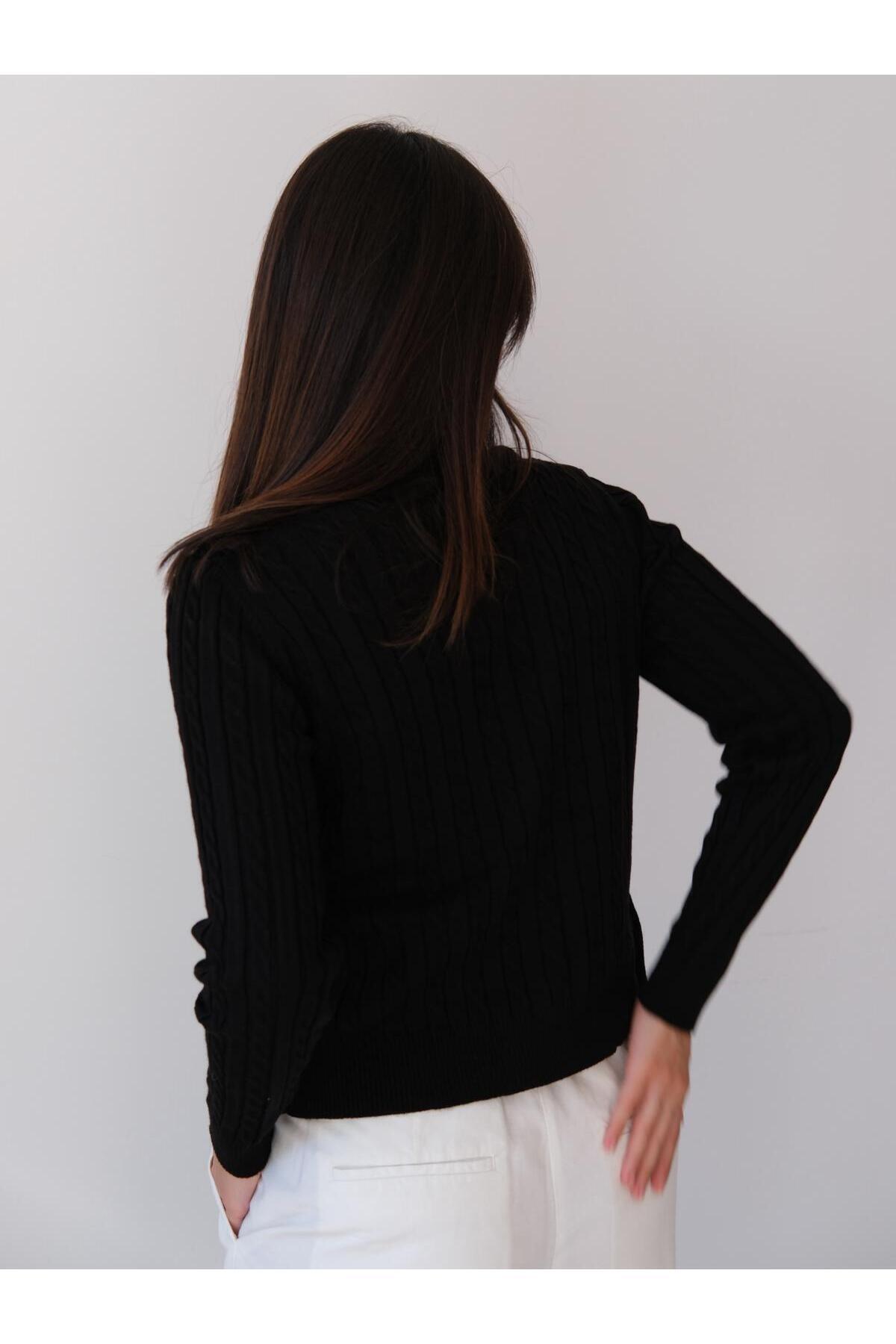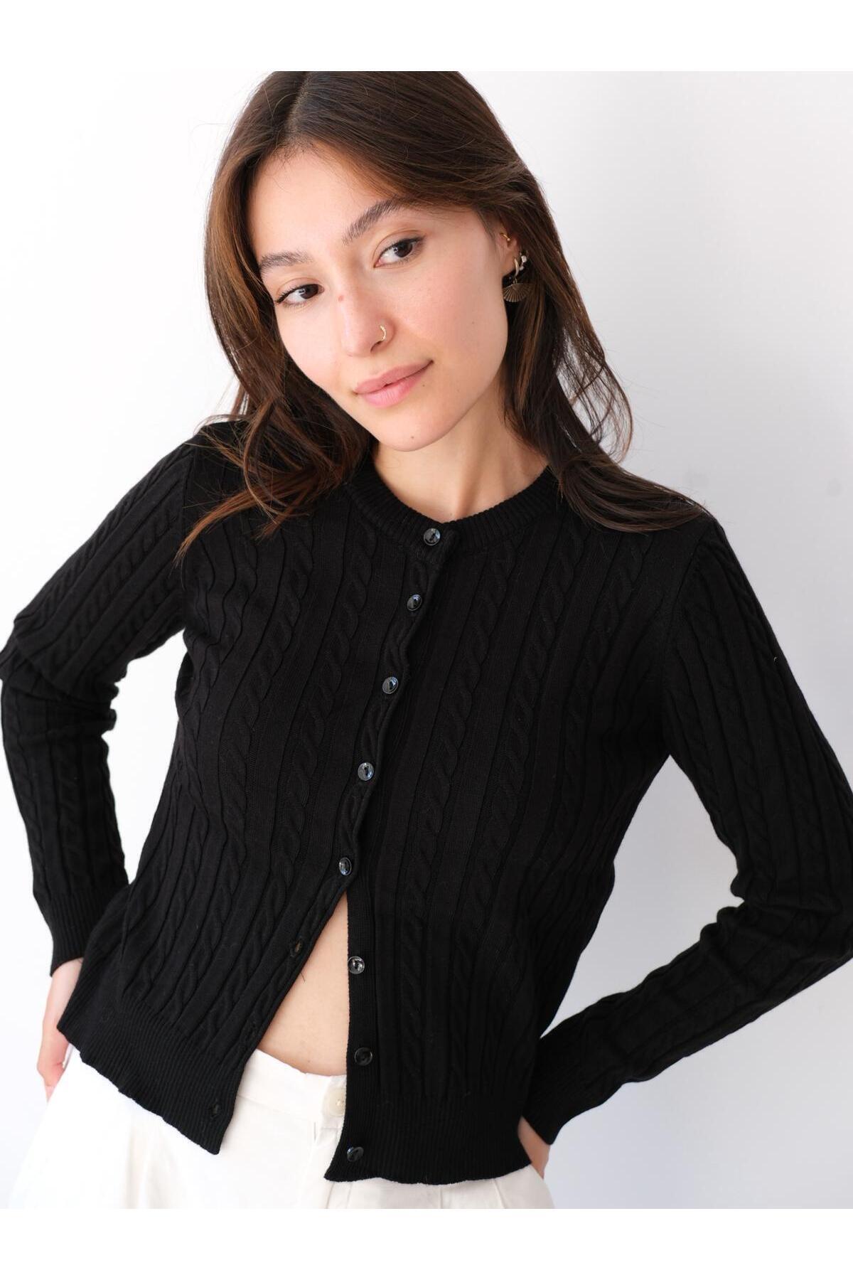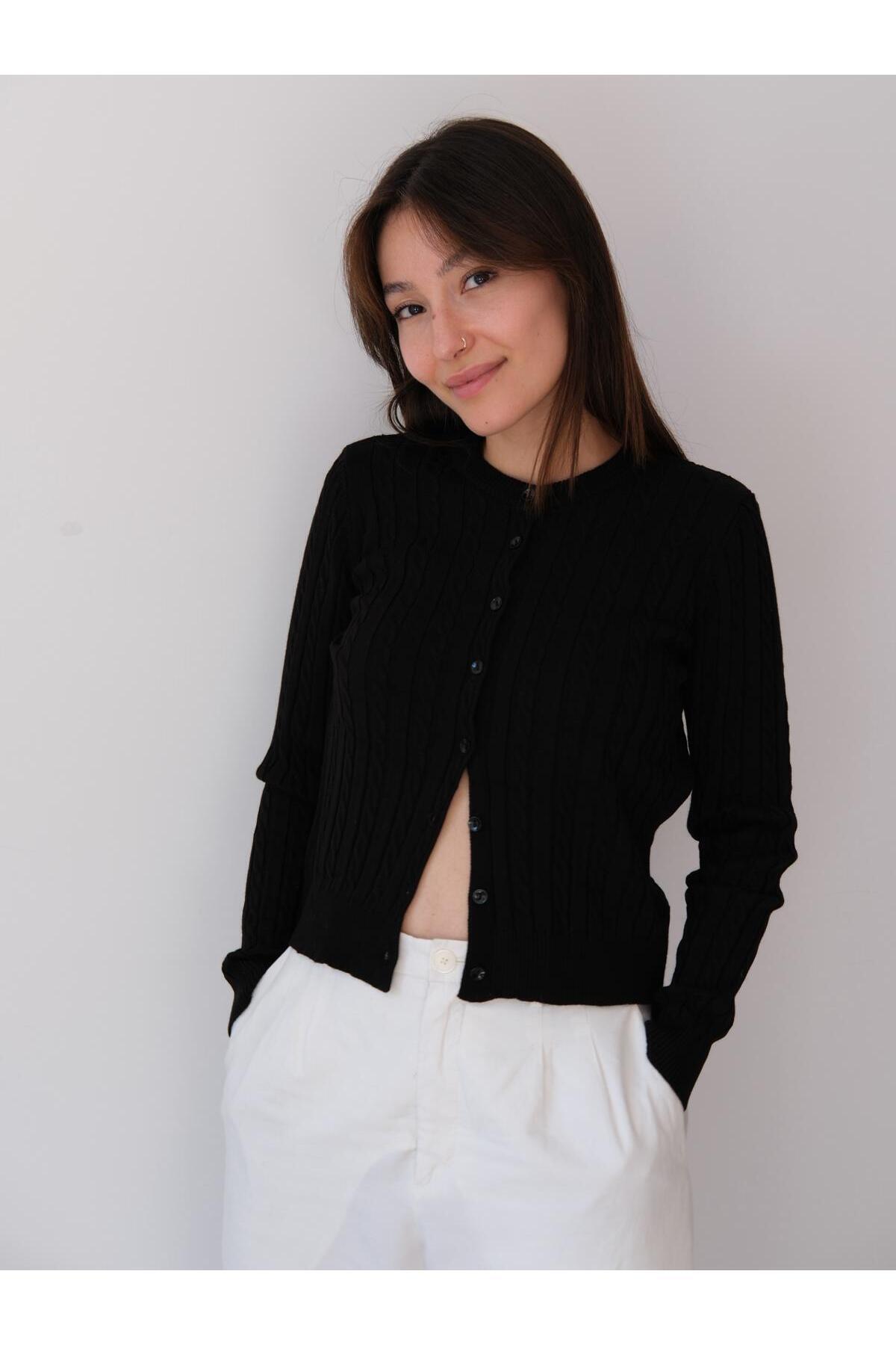 Una Fiaba- Siyah Düğmeli Saç Örgü Kadın Triko Hırka Una Fiaba- Siyah Düğmeli Saç Örgü Kadın Triko Hırka 252491 XL
