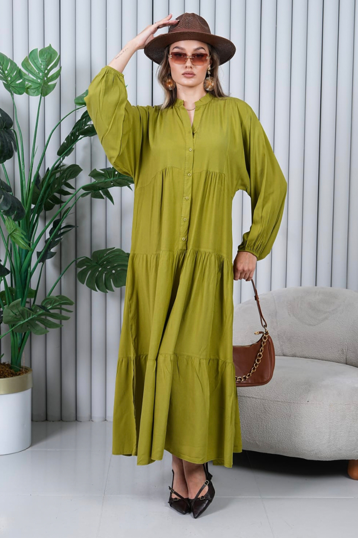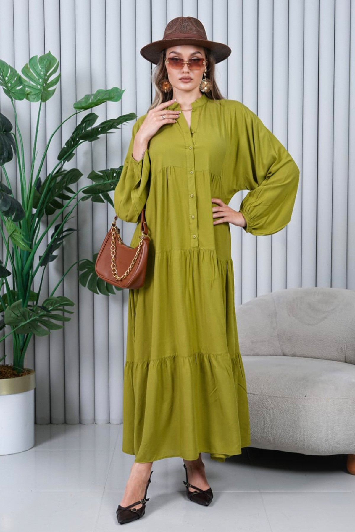 Kadın Yağ Yeşili Düğmeli Patlı Yakalı Oversize Salaş Balon Kollu Uzun Elbise Kadın Yağ Yeşili Düğmeli Patlı Yakalı Oversize Salaş Balon Kollu Uzun Elbise 00-ALA XL/2XL