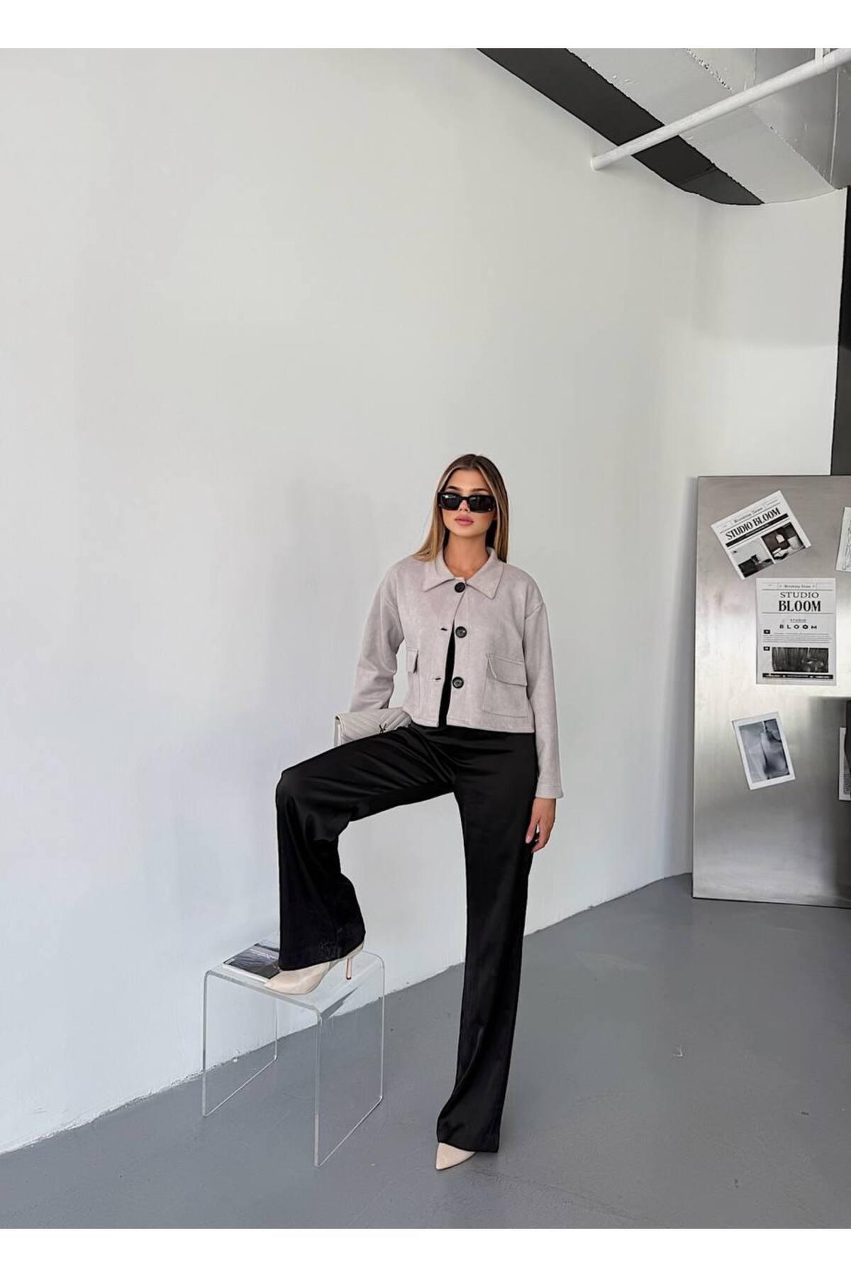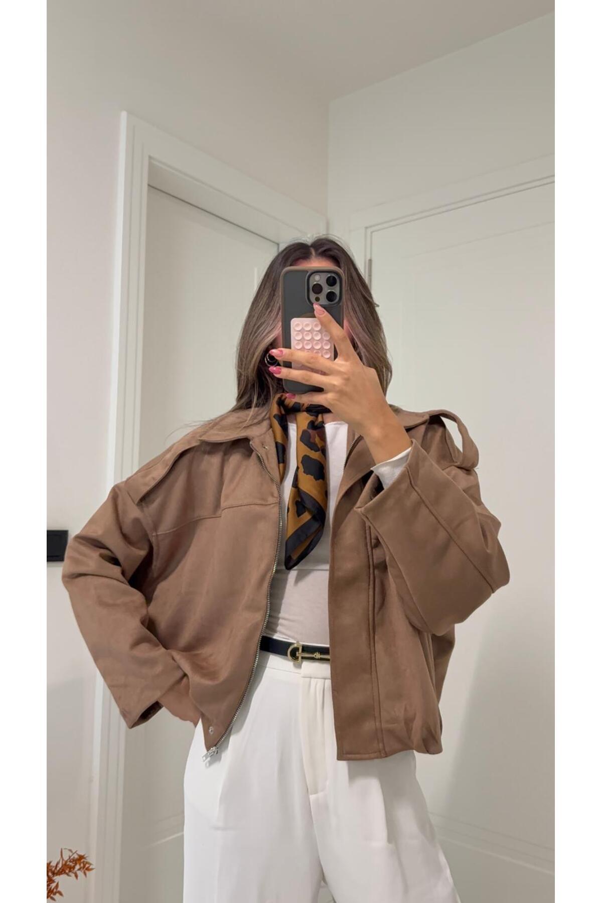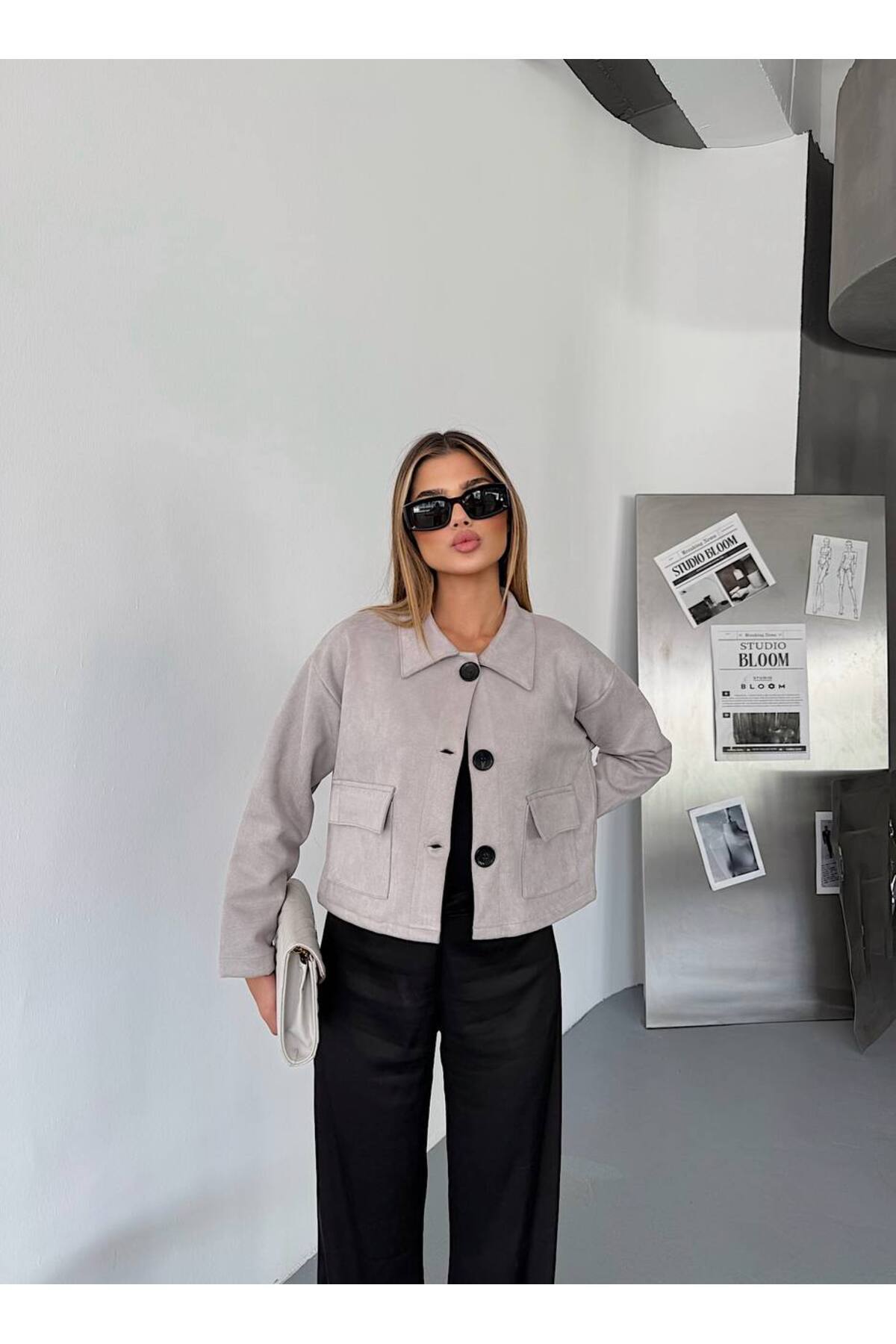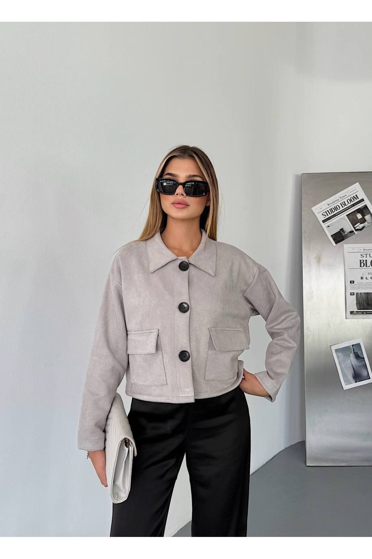 Kadın Gri Cepli Süet Ceket - Düğmeli, Kadın Gri Cepli Süet Ceket - Düğmeli, KECH0202 L