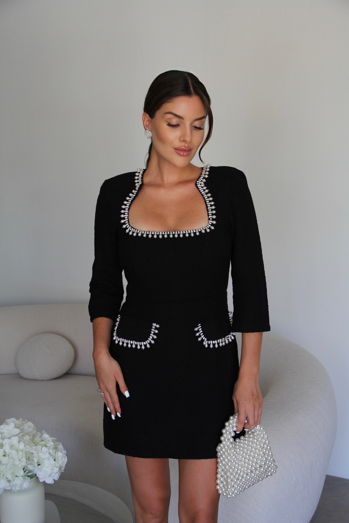 Siyah inci Detaylı Vatkalı Mini Boy Premium Tasarım Tüvit Elbise Siyah inci Detaylı Vatkalı Mini Boy Premium Tasarım Tüvit Elbise Julidress2025TVT30 XL