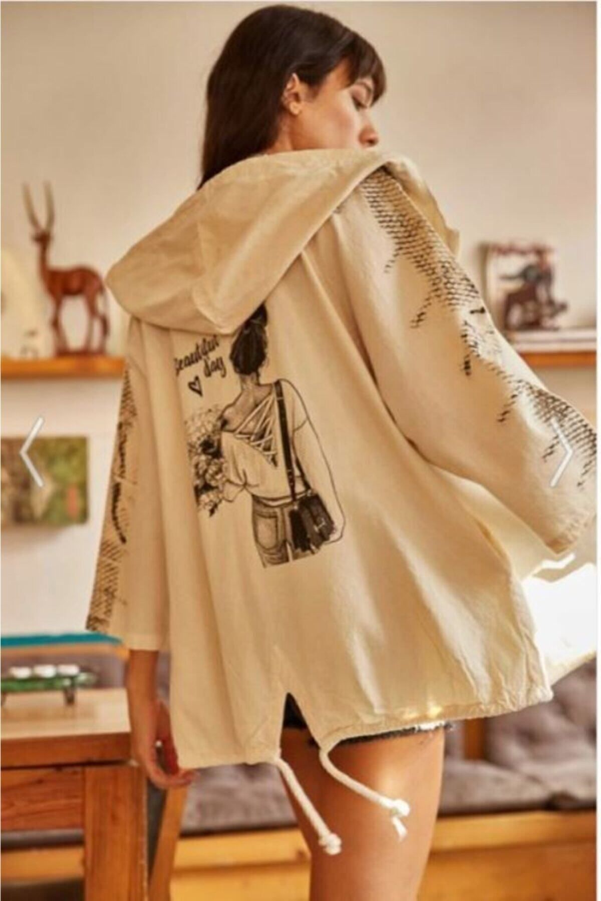 İtalyan Keten Dantel Detaylı Kapüşonlu Ceket - VİZON İtalyan Keten Dantel Detaylı Kapüşonlu Ceket - VİZON HEB4100 Standart