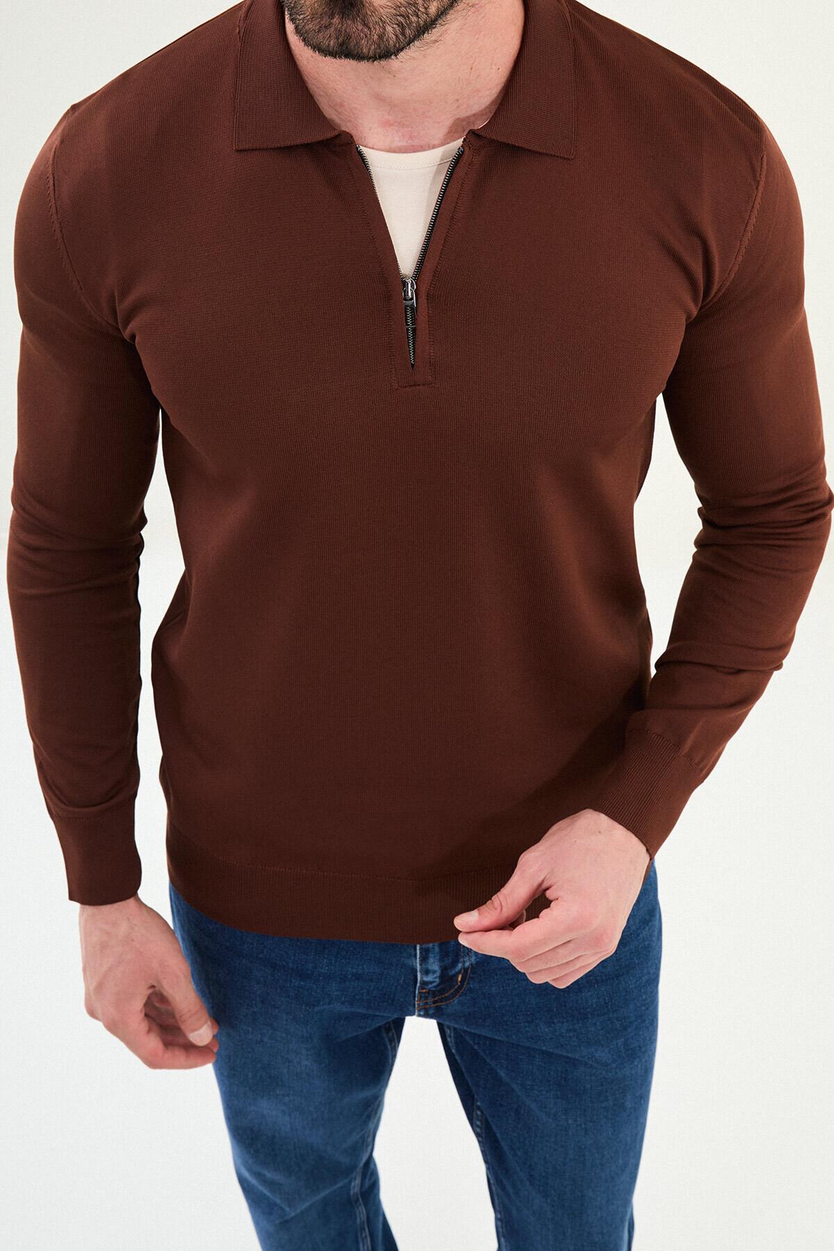 Düz Slim Fit Fermuarlı Polo Yaka Erkek Triko Kazak Kiremit - 11560.25K Düz Slim Fit Fermuarlı Polo Yaka Erkek Triko Kazak Kiremit - 11560.25K 2XL