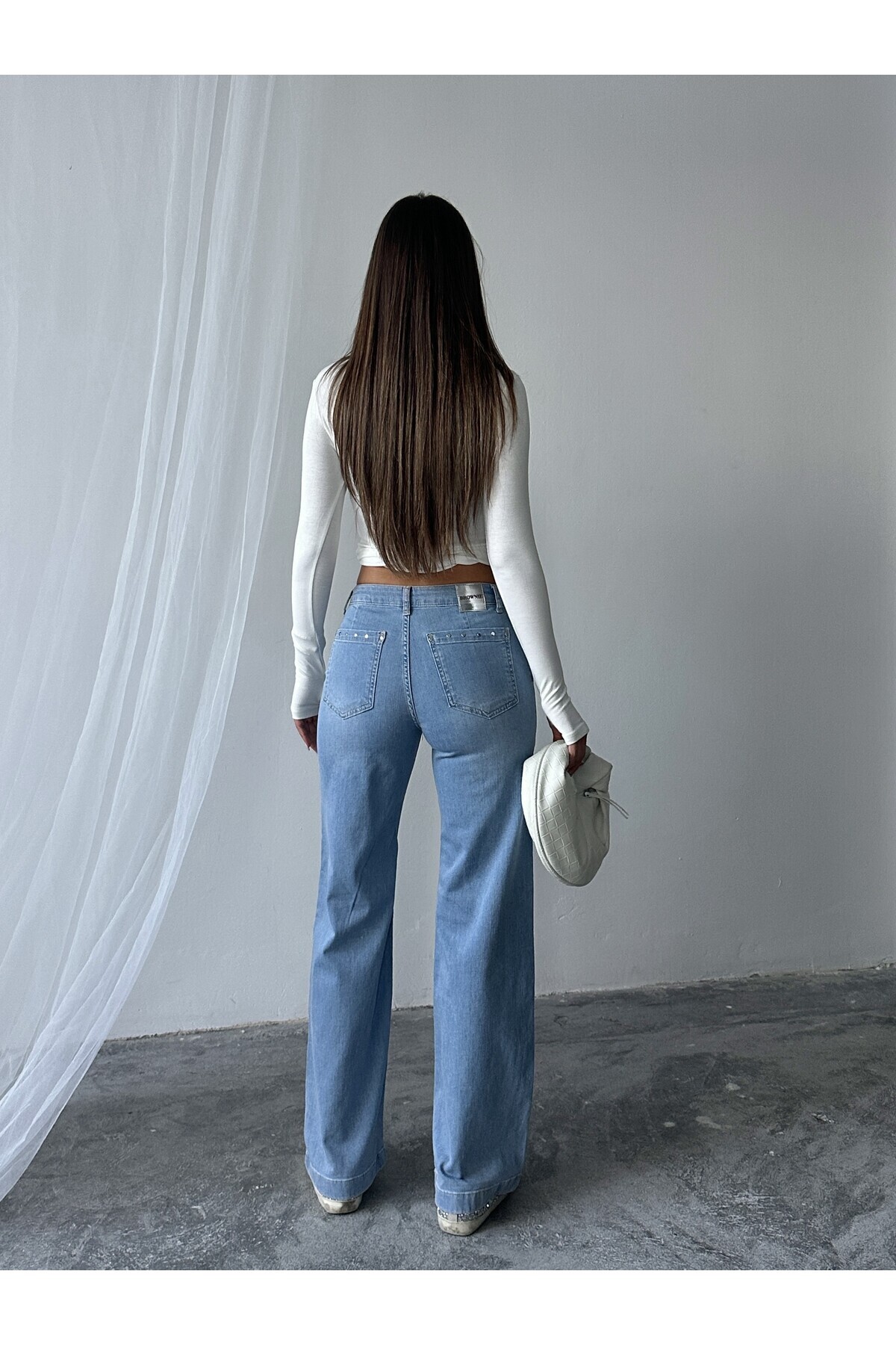 Açık Mavi Taş Desenli Wide Leg Kadın Pantolon Açık Mavi Taş Desenli Wide Leg Kadın Pantolon 11 2XL