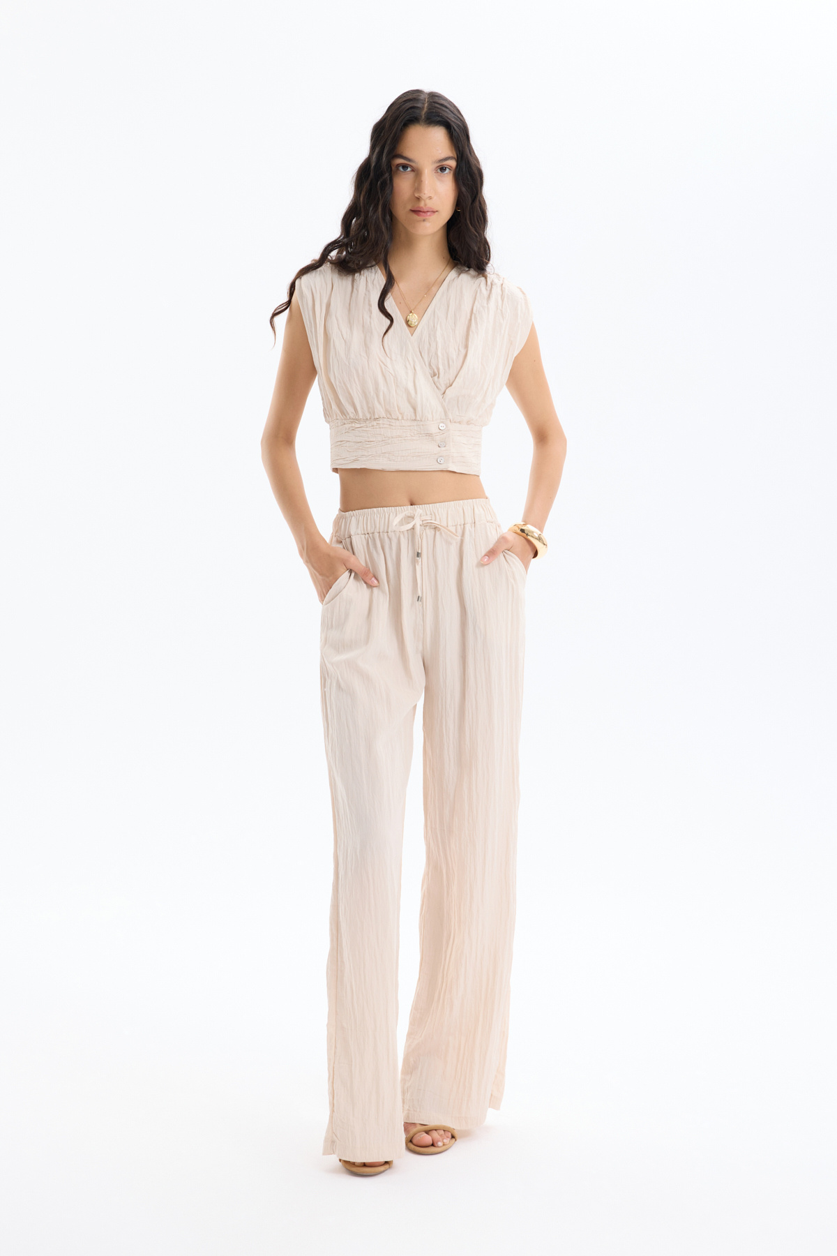 Kırışık Görünümlü Beli Lastikli Pantolon Siyah Kırışık Görünümlü Beli Lastikli Pantolon Siyah 25YPNT00196 L