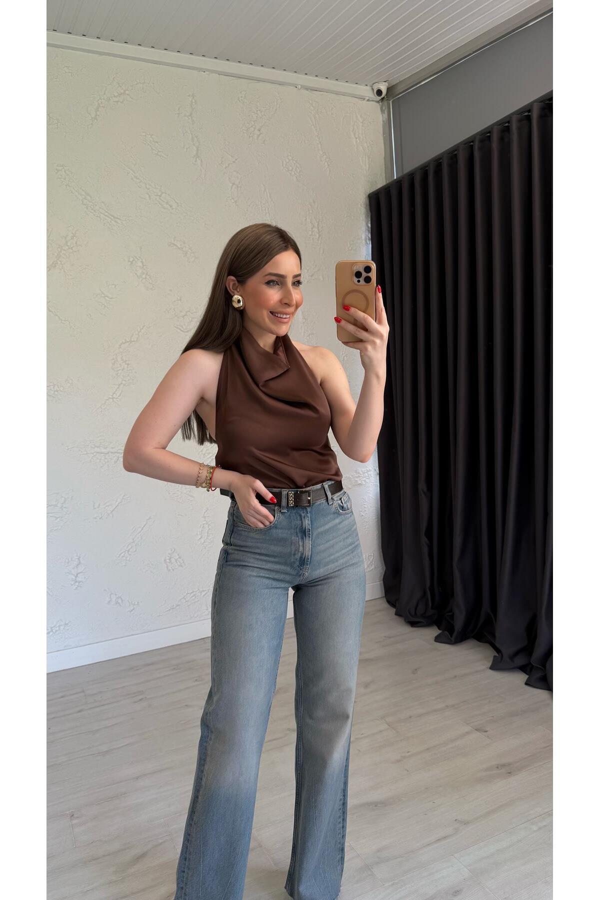 Kruvaze Yaka Asimetrik Kesim Kahve Saten Bluz Kruvaze Yaka Asimetrik Kesim Kahve Saten Bluz BLZ-0209-KHV L