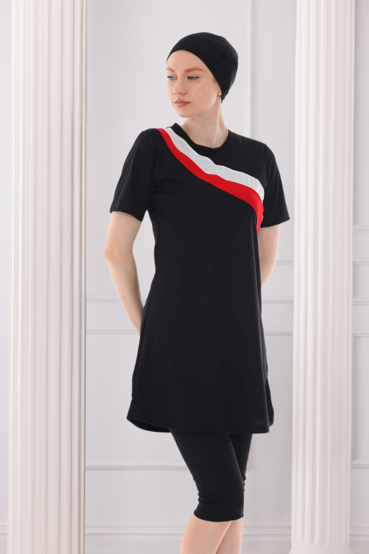 Kırmızı Şeritli Kısa Kollu Likralı Yarı Kapalı Tesettür Mayo Takım Kırmızı Şeritli Kısa Kollu Likralı Yarı Kapalı Tesettür Mayo Takım TEMA01 56