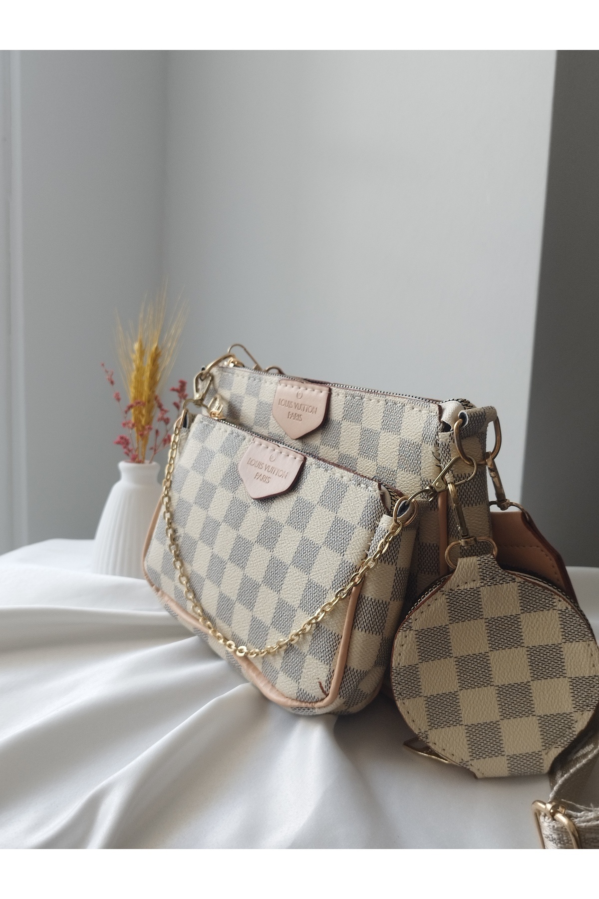 Kadın Krem Deri Damalı Desen 3'lü El Omuz ve Çapraz Çanta Kadın Krem Deri Damalı Desen 3'lü El Omuz ve Çapraz Çanta ÇAN0105 Standart